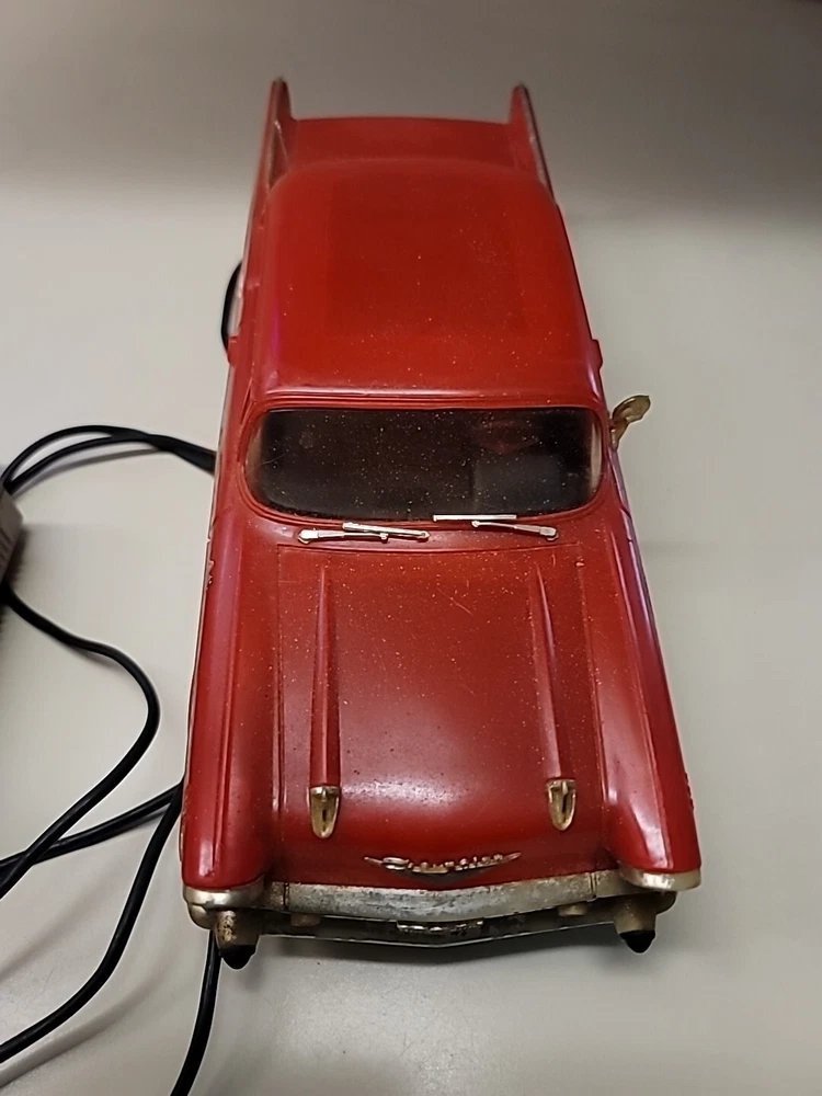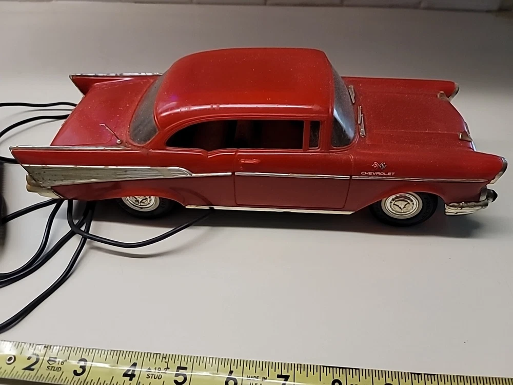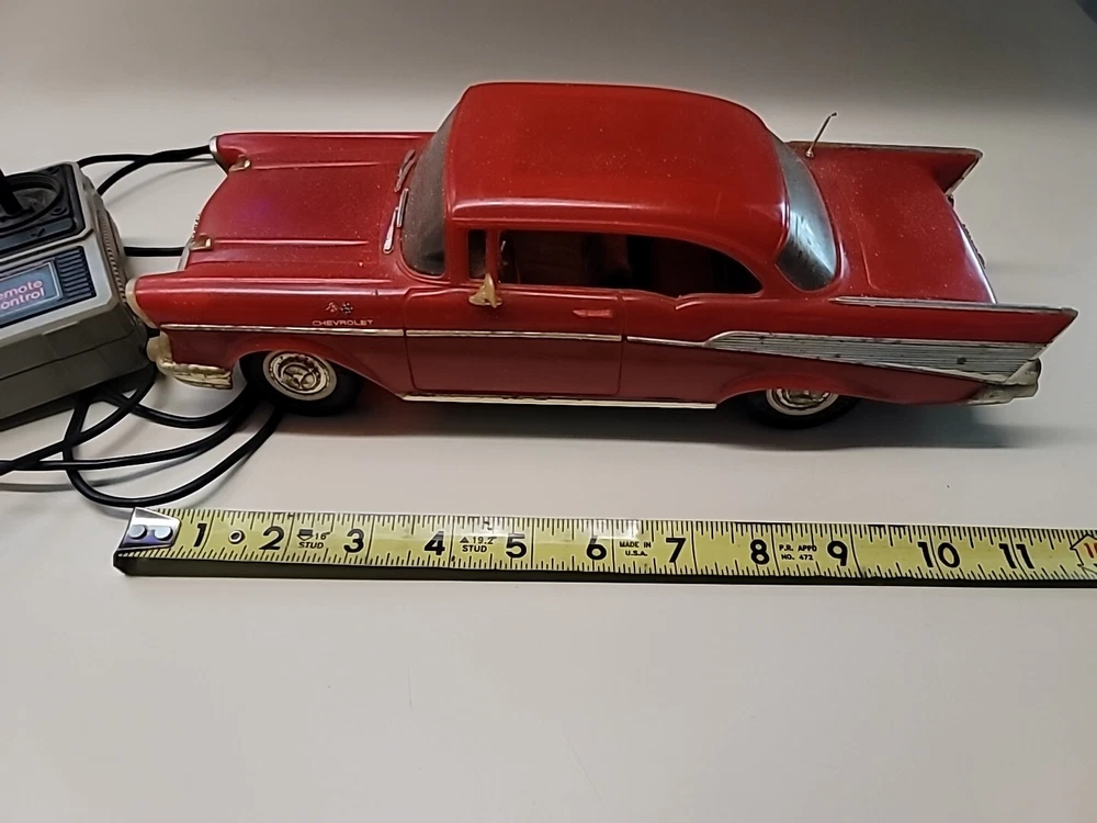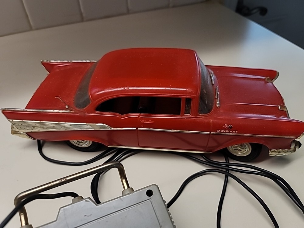 This vintage 1986 New Bright 57 Chevy wired remote control car from Hong Kong has been tested and works perfectly. The car is a great addition to any collection and is sure to bring back memories of childhood playtime. The brand, New Bright Industrial Co., Ltd, is known for producing high-quality RC model vehicles and this Chevy is no exception. The car is a replica of the classic 57 Chevy and is made with attention to detail. It is perfect for display or for children to play with. The car comes with a wired remote control that allows it to be controlled from a distance. This item is categorized under Toys & Hobbies, Radio Control & Control Line, and RC Model Vehicles & Kits. Don't miss out on the opportunity to own this piece of nostalgia. See all pics for description and measurements and any imperfections Tested all functions work