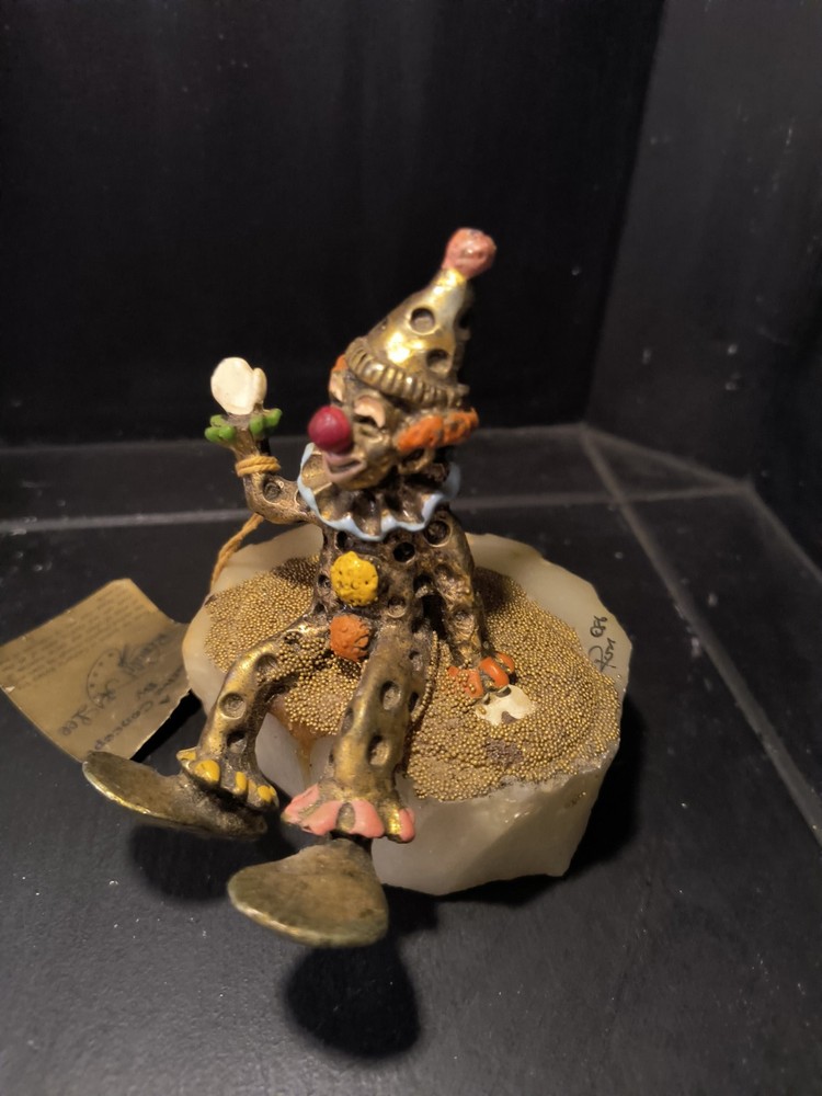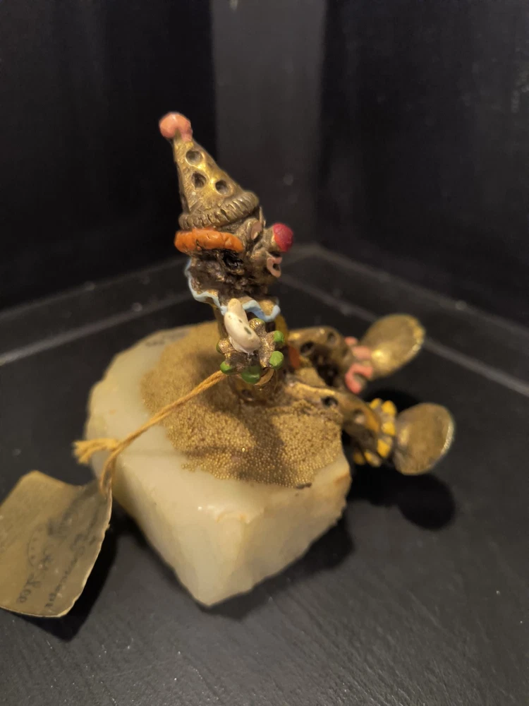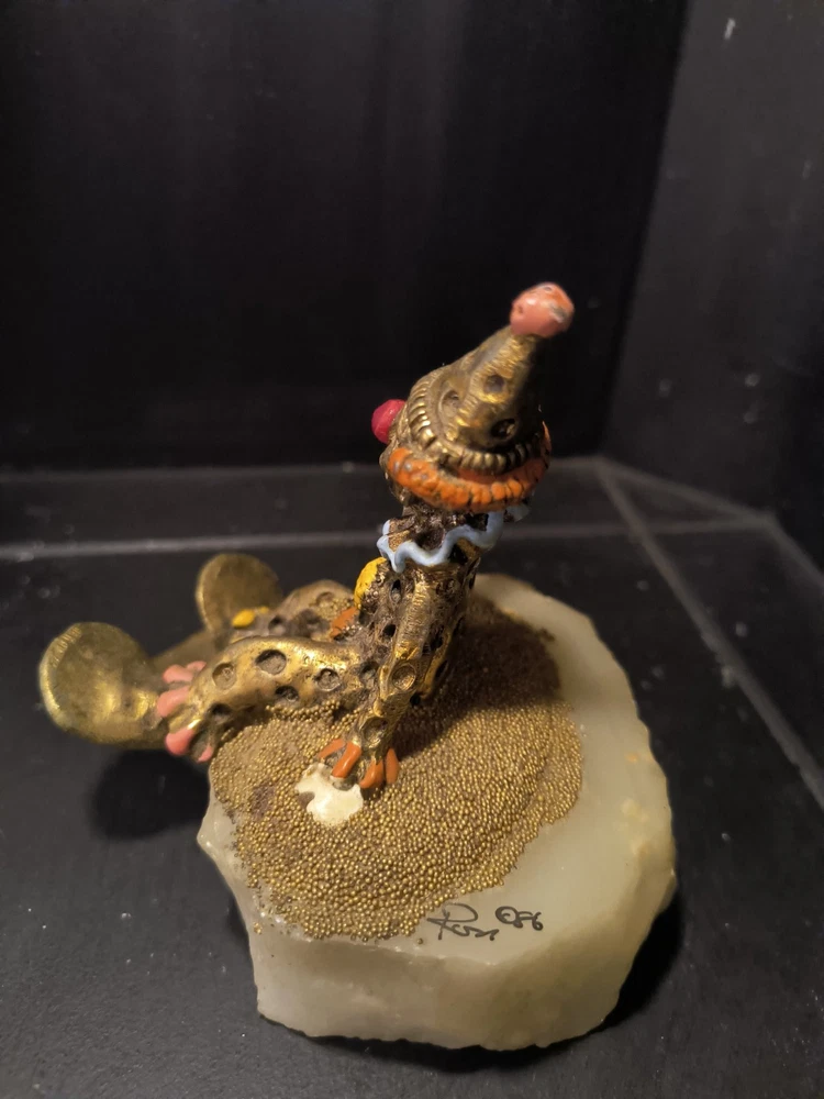 Vintage Ron Lee Waving Clown Sculpture 4.5 Inches 1986 This is a Ron Lee Clown figurine, a collectible sculpture known for its 24K gold-plated details and hand-painted features. Here's some helpful information about it: Artist: Ron Lee (1947-2001) was an American artist famous for his whimsical clown figurines. Material: The figurine is made of pewter with 24K gold plating and sits on a stone or marble base. Signature: Most Ron Lee figurines are signed and dated by the artist. The one in the image is signed "Ron c86". Year of Production: 1986 Design: The clown is sitting and waving, with a polka-dot outfit and a ruffled collar. Collectibility : Ron Lee's clown figurines are popular among collectors, and their value can vary depending on the rarity, condition, and age. Care: These figurines should be handled with care to avoid damage to the delicate gold plating and paint.