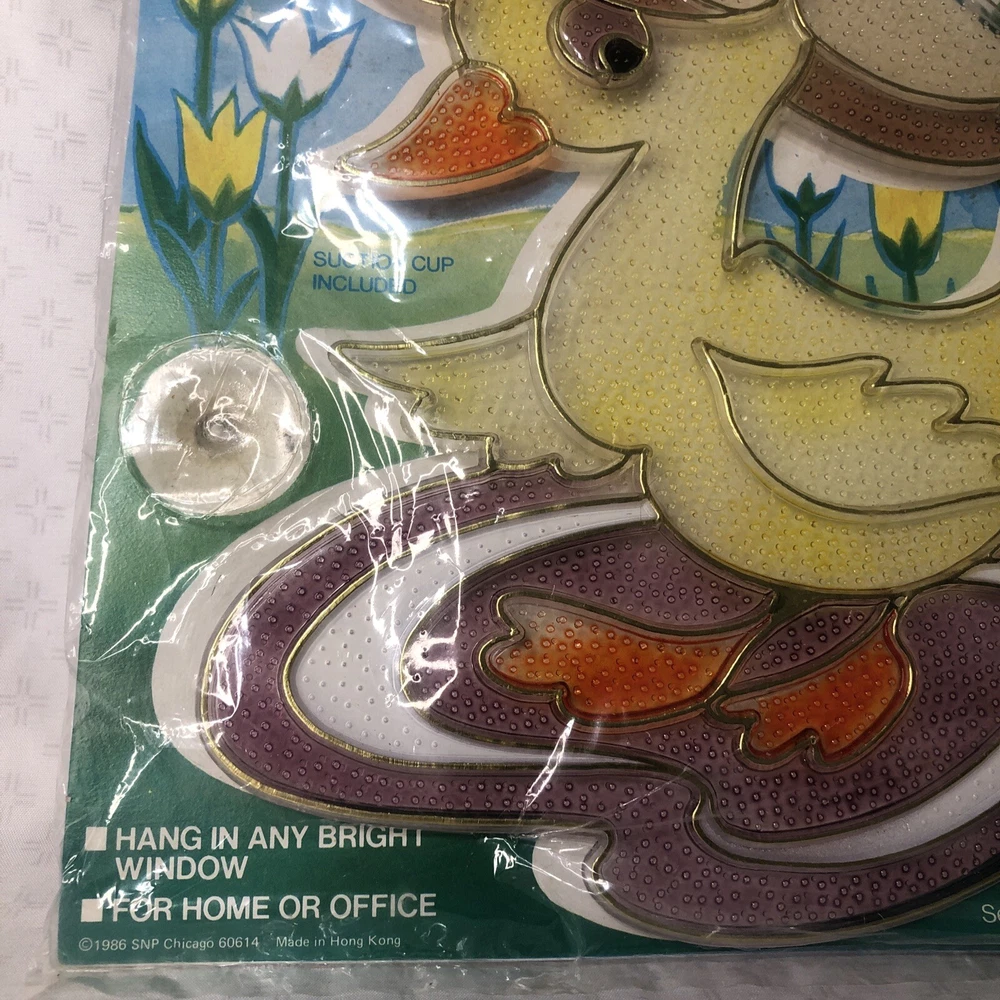Add a touch of vintage charm to your home decor with this Tiffany-Like Duck Sun Catcher from 1986. This decorative suncatcher features a beautiful design that is sure to catch the eye of anyone who sees it. It is perfect for adding a cozy and welcoming atmosphere to any room in your home. Crafted with care, this suncatcher is a great addition to your collection of decorative accessories. It is a perfect gift for your loved ones or a nice treat for yourself. The duck design is whimsical and playful, making it a great addition to any space. This suncatcher is a great way to bring a touch of nature into your home. ** as seen in photos ,, yellow is faded in the duck design.