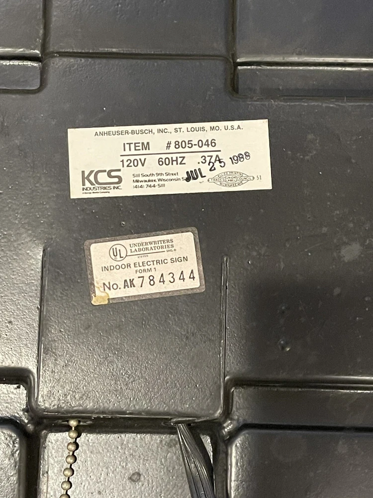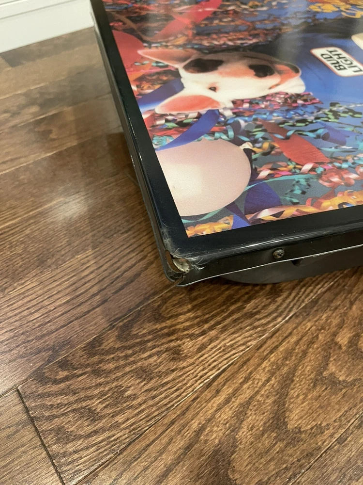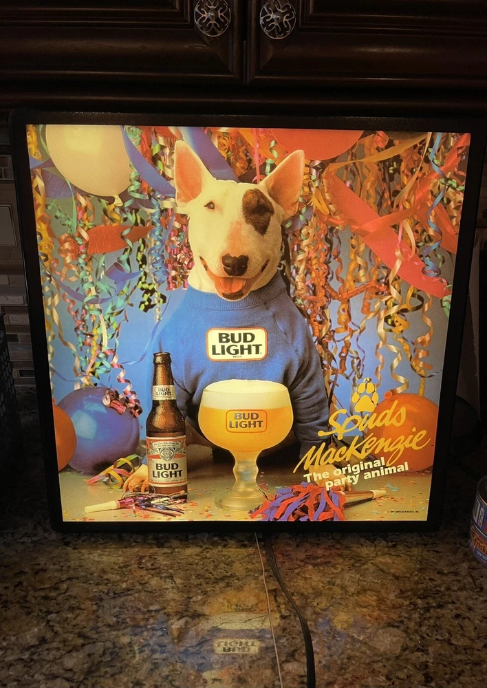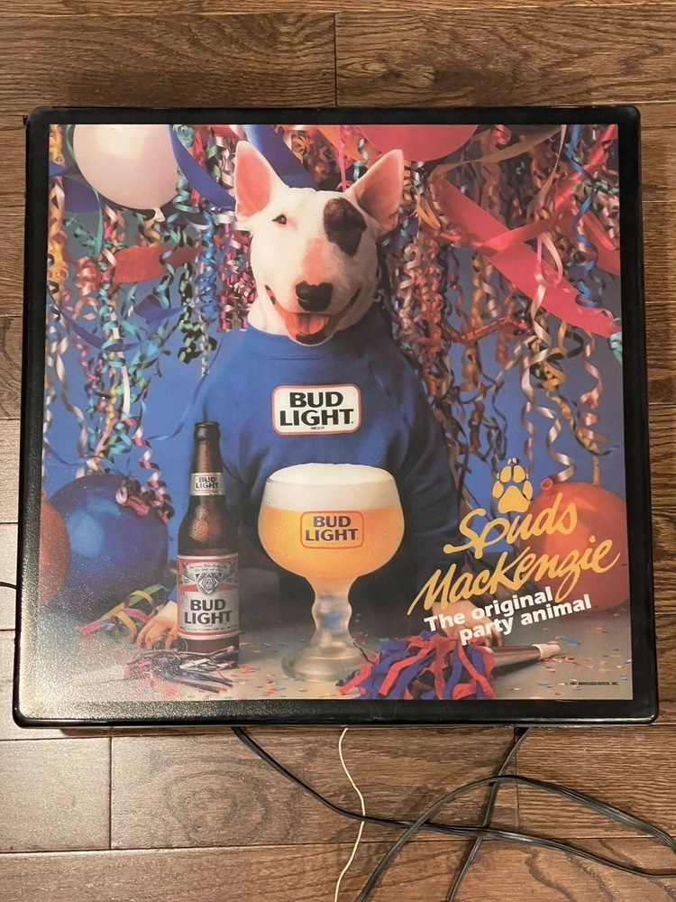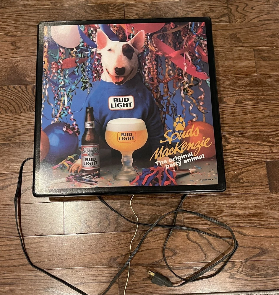 Illuminate your space with a touch of vintage charm with this 1987 Bud Light Spuds MacKenzie Beer Light Lamp Bar Sign. A true gem for collectors, this piece celebrates the iconic Budweiser breweriana with a classic design that's sure to be a conversation starter in any setting. this sign/ light is a testament to the brand's rich history and the beloved character of Spuds MacKenzie. It's a non-modified, authentic object that promises to enhance your collection of beer memorabilia or add a nostalgic flair to your home bar or man cave. Broken corner- see pictures Electric Works- lights up when plugged in Pull chain @18”x18” square @5” deep