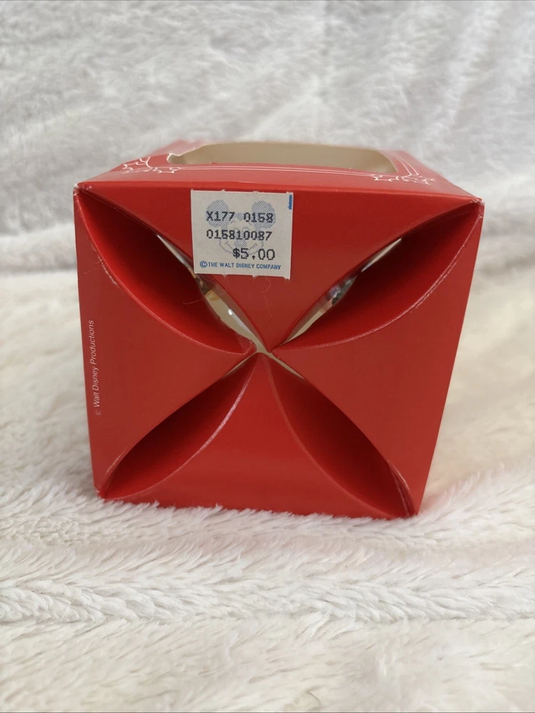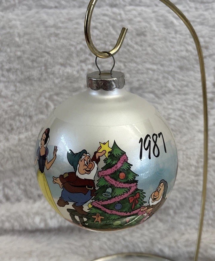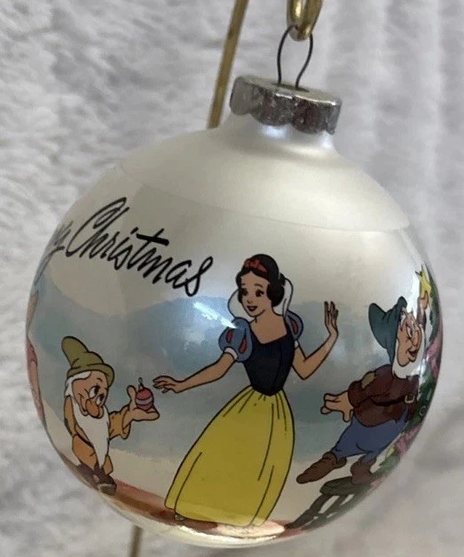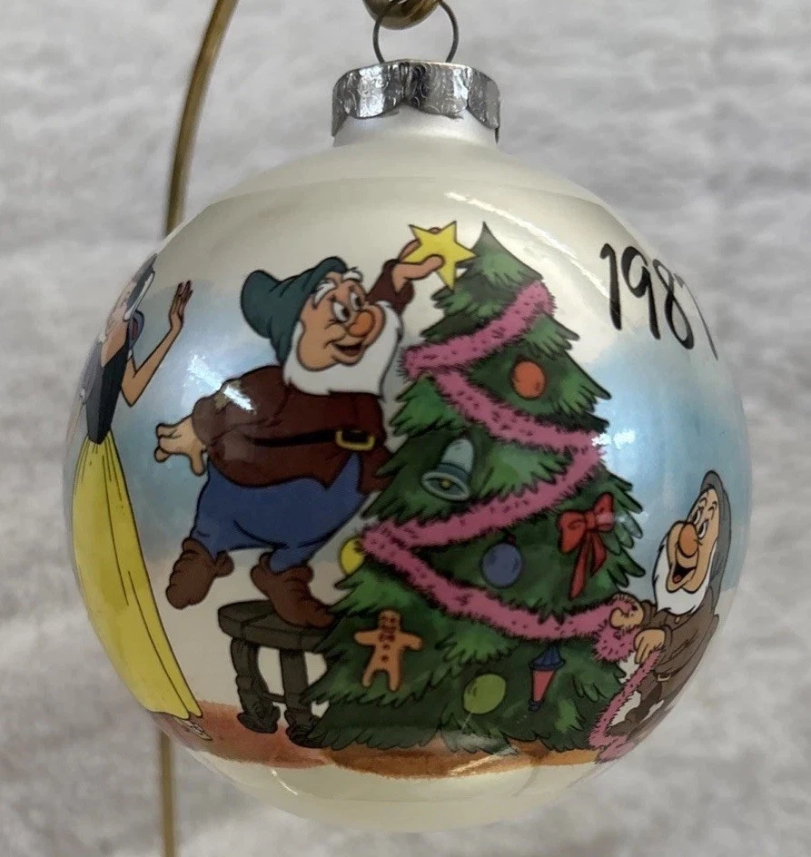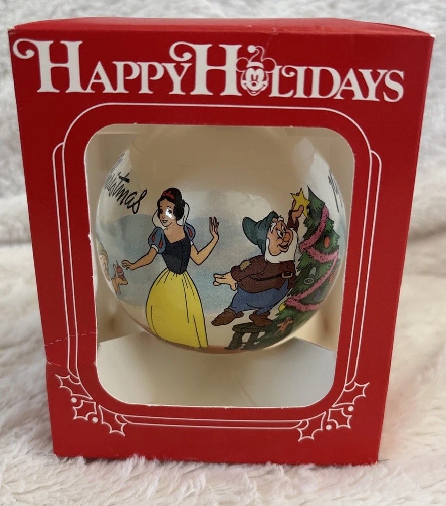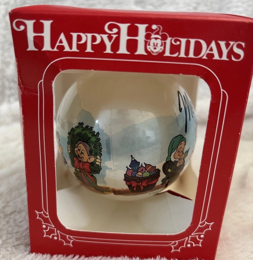 The Vintage 1987 Snow White and the 7 Dwarfs Disney Store Christmas Ornament is a collectible item featuring the beloved characters from Disney's Snow White franchise. Made of glass and produced by Disney in 1987, this ornament showcases the iconic scenes from the classic animated film. It serves as a nostalgic piece for fans of Disney and collectors of vintage memorabilia, adding charm to any holiday decor with its timeless appeal. In original box