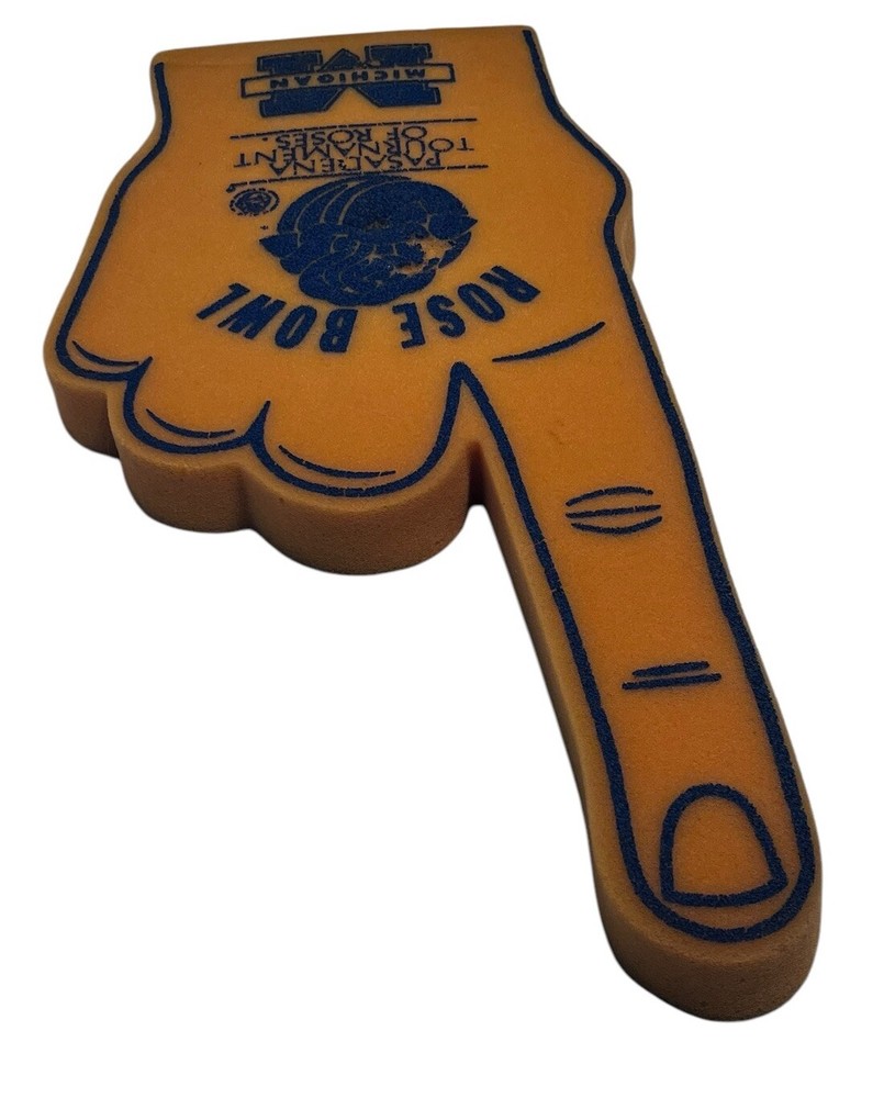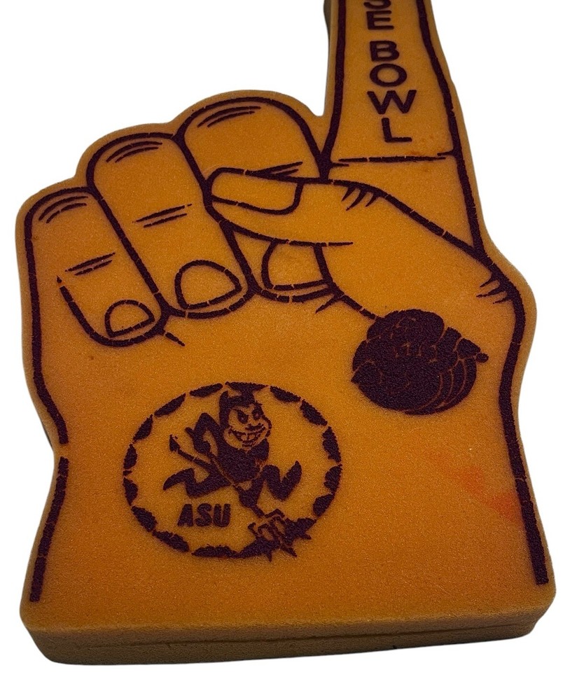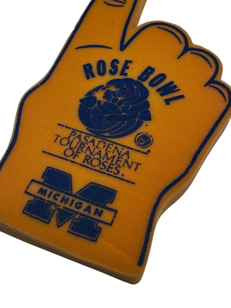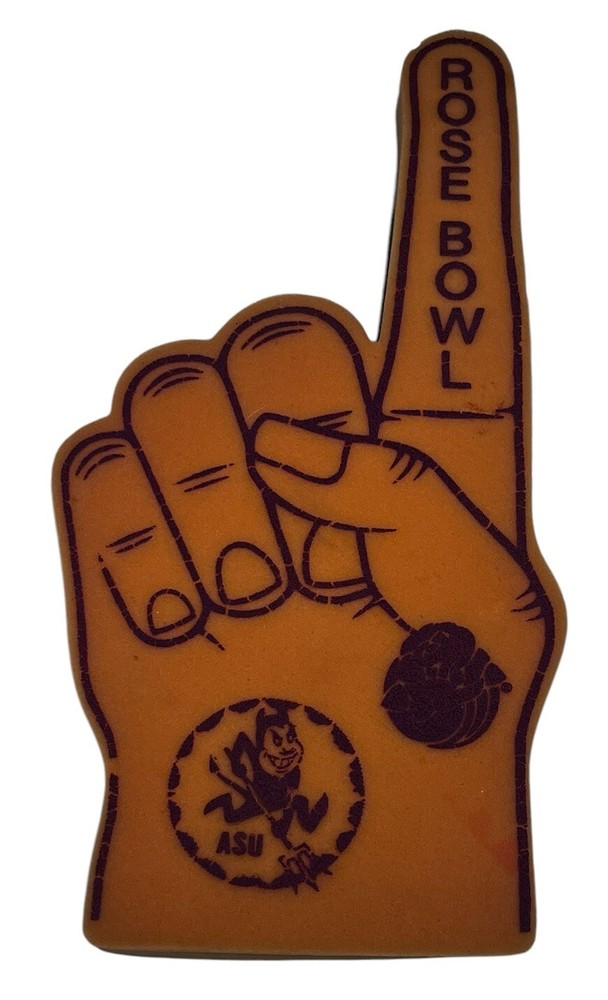 Vintage Rose Bowl Foam Finger Michigan Arizona State 1987 23” Pasadena Football. Good preowned condition showing low normal signs of wear/use. The farm is showing some light peeling/flaking simply from age. Very cool collectors piece. Represents the Michigan Wolverines on one side and the Arizona State Sun Devils on the other side. It is approximately 23“ x 10“. Please see photos for design and condition details. Don’t hesitate to message me with any questions.