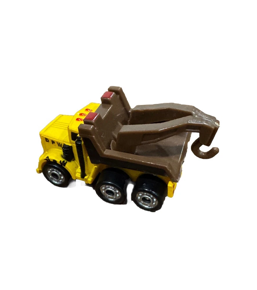 The vintage 1988 Funrise Die-Cast DPW Work Tow Truck is a yellow and brown construction vehicle made of diecast material. This collectible toy features a classic design of a tow truck from 1988, ideal for vintage toy enthusiasts or collectors. The vehicle type is a tow truck, and it showcases the brand Funrise, known for producing quality die-cast vehicles.