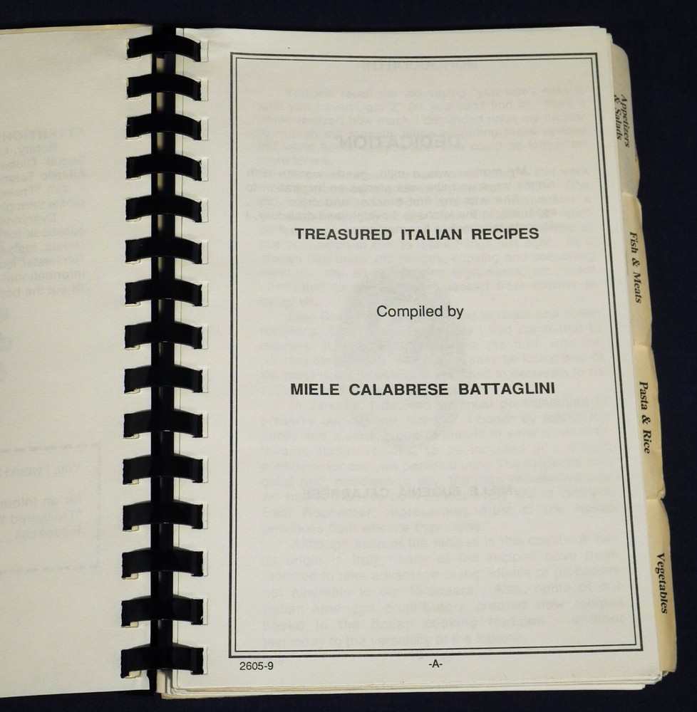 This is for a Cookbook: Treasured Italian Recipes by Miele Calabrese Battaglini . Spiral bound Softcover book, published by East Rochester Rotary Club, dated 1989 in front; approximately 8-5/8 in. by 6-5/8 in.; 202 pages + appendix. Good to Very Good condition, light wear, a few minor stains, see also pictures. Buyer to pay $5.00 for shipping and handling for U.S. address. We ship worldwide. International costs to be determined. Please click on 'See Details' for quote. We combine shipping if possible. Please take the time to read the following: Payment should be received within 3 days of purchase. We only ship to the address shown on the paypal payment. Because we are selling fresh items from estates, barns, etc., expect signs of wear and usage appropriate with the age of such items. We usually take multiple photographs of an item. Please check for a second row of photos, they often are there but can be overlooked. Photographs are part of the description and show all that is included. We photograph and accurately describe every item as to its condition and authenticity to the best of our ability. If you have any questions, please let us know. We often have similar items available, so please see our Other Items , or go to our 'ewkauctions' ebay store .