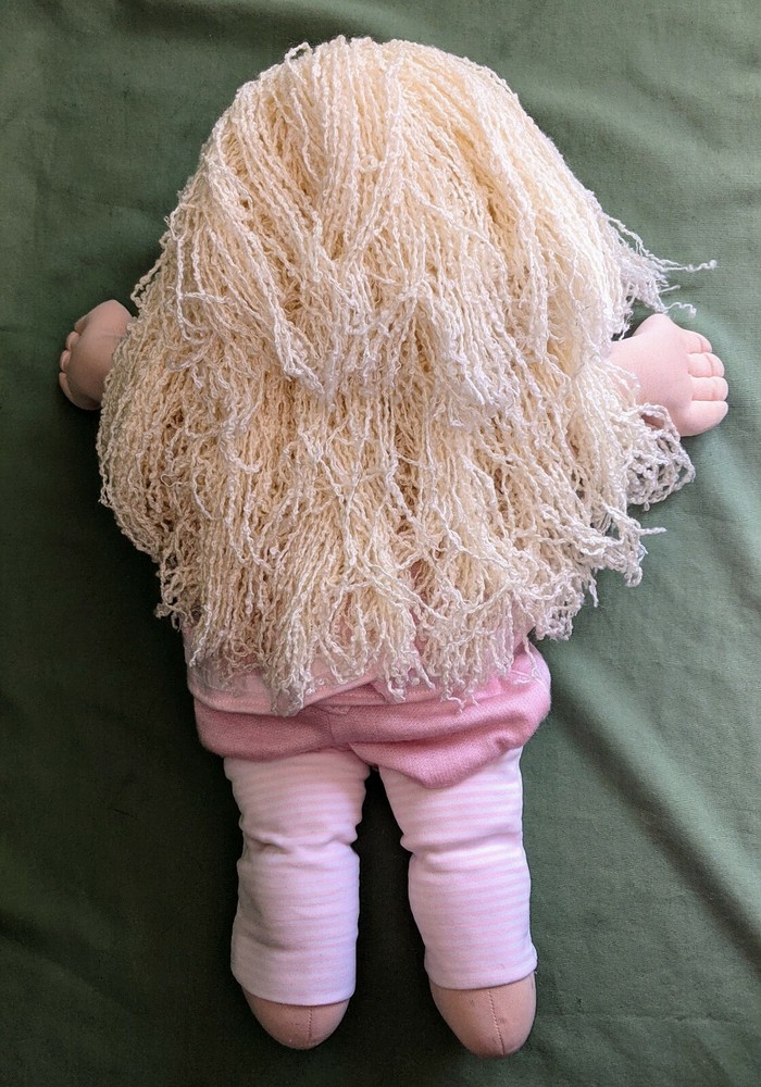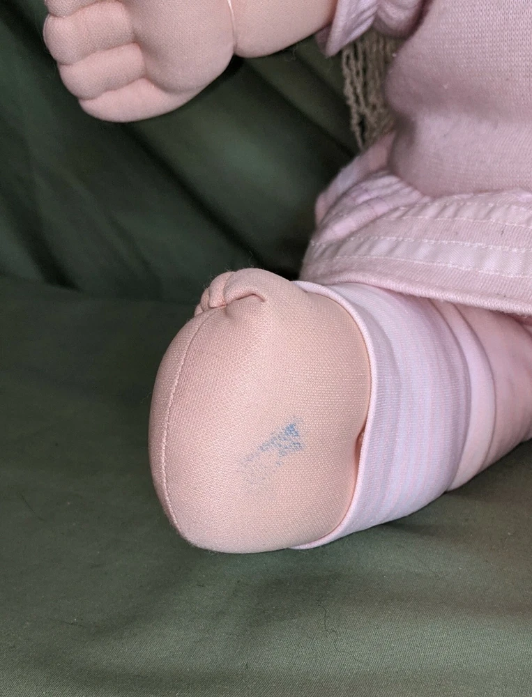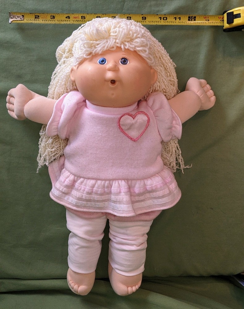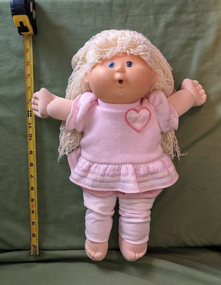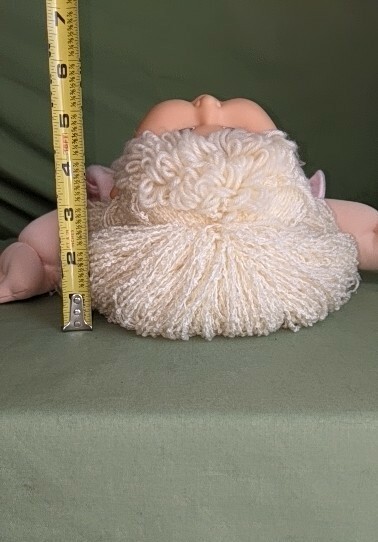 Doll is 18" tall, 7" wide with arms pulled in, 14" wide with arms outstretched and head makes it 5 1/2" deep. Pink shirt with heart and pink pants with stripes on legs. Hole in mouth for pacifier or bottle (not included). Dimple in chin. Long, soft, kinky noodle hair (see pictures). No shoes. Any questions, please ask.