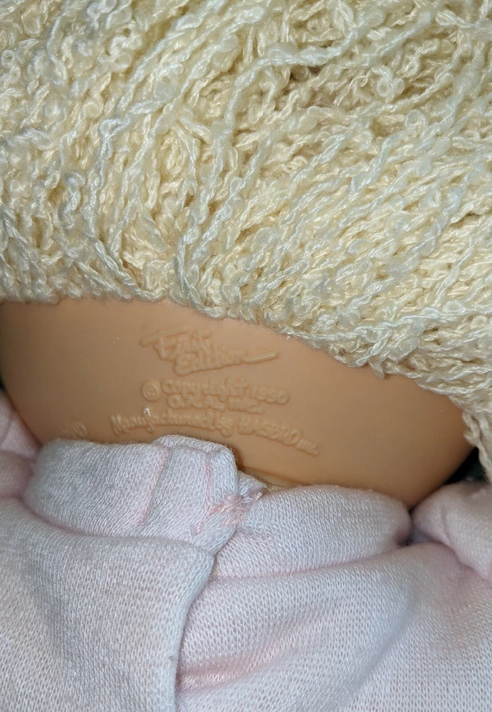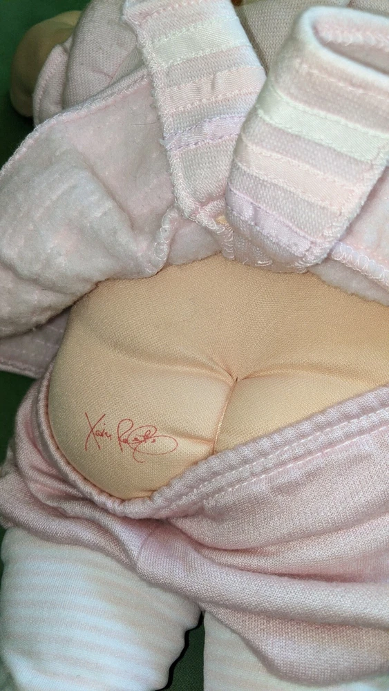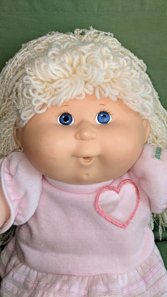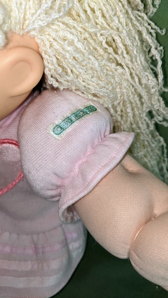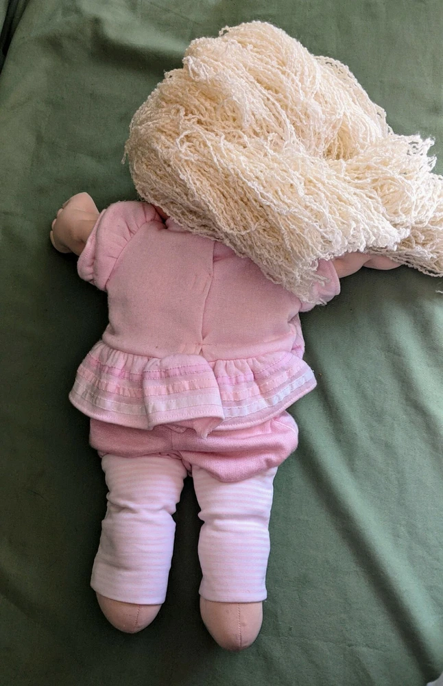 Doll is 18" tall, 7" wide with arms pulled in, 14" wide with arms outstretched and head makes it 5 1/2" deep. Pink shirt with heart and pink pants with stripes on legs. Hole in mouth for pacifier or bottle (not included). Dimple in chin. Long, soft, kinky noodle hair (see pictures). No shoes. Any questions, please ask.