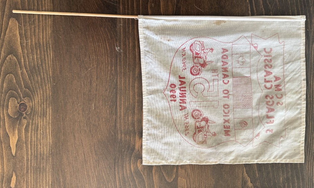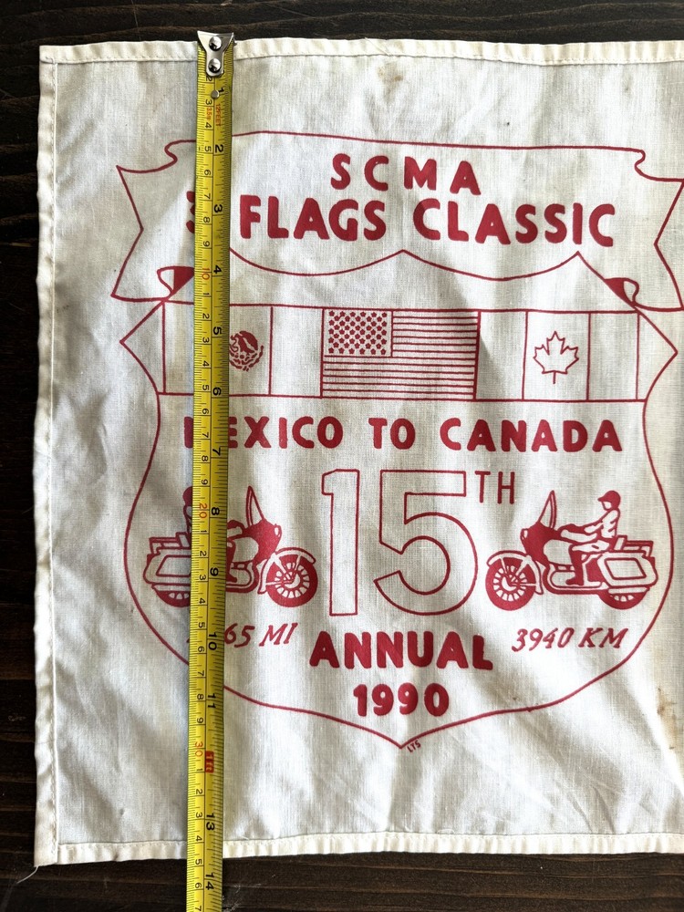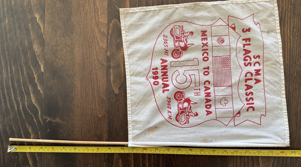 VINTAGE 1990 15TH ANNUAL SCMA 3 FLAGS CLASSIC MEXICO TO CANADA CLOTH FLAG FLAG IS APPROXIMATELY 13" by 12" WOOD POLE IS ABOUT 2 FEET LONG GOOD CONDITION, SOME COLOR FADING, SOME STAINS, GENTLE USAGE PLEASE ZOOM INTO OUR PICTURES SO YOU CAN SEE MORE DETAILS WE COMBINE SHIPPING THANK YOU FOR LOOKING Disclaimers All items are from local estate sales and garage sales around San Diego, Ca. All items sold by us are being described to the best of our ability and with utmost conscientiousness on our part, but please know we are not experts. To avoid any potential oversights, we respectfully request your assistance in thoroughly reviewing the description, photos and asking questions prior to Buying/Bidding. Any damage will be mentioned and included in photographs. Shipping Item(s) will be shipped within 1 business day (Monday-Friday) after payment has cleared. Depending on the fragility of the item, combined shipping may not be available on all items . Please message me to discuss shipping options. Return Policy 100% Satisfaction Guaranteed. We want to ensure that you are completely satisfied with your purchase. If not, then please let us know by messaging us on eBay before leaving any feedback & allow us to work with you to completely resolve any issues that you might be facing with your order. If you feel that you got an item that is different from what you ordered or if it arrived damaged or if you have any problems with the item, please email us & we will be glad to work with you in resolving any issues. All returns must reach us within 30 days after the item was delivered to you. The items must be in their original condition when they were sent to you. We will issue you a refund within 3 business days once the item has been received. Note: Depending on the reason for return, the original cost of shipping may not be included in refund amount.