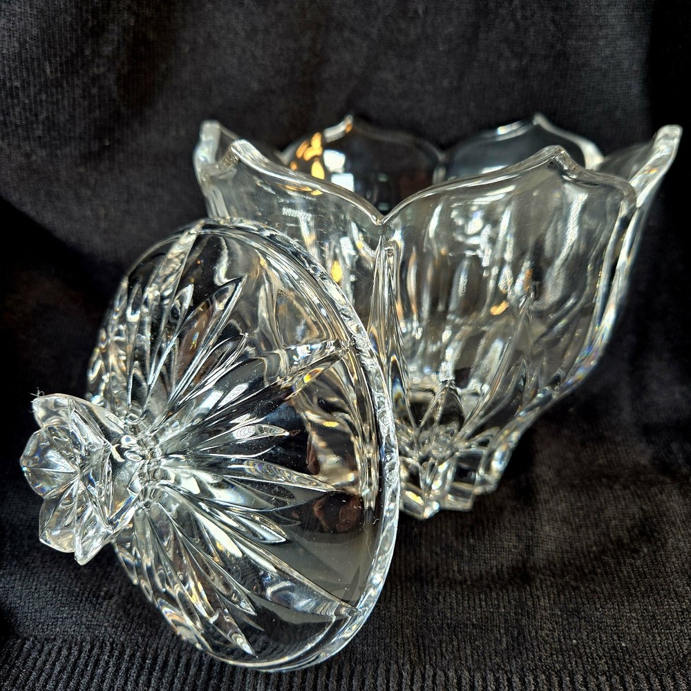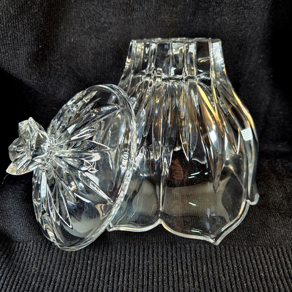 The Vintage1990-1994 Gorham Lead Crystal Lotus Covered Candy Dish is a stunning piece made in Germany. Standing at 6 inches tall, this elegant candy dish features a clear crystal material with a lid, making it a perfect addition to any collector's display. The intricate lotus design adds a touch of sophistication to any space, while its original manufacturing year of 1990-1994 adds to its timeless appeal. Perfect for storing and showcasing candies or other small items, this Gorham candy dish is both functional and decorative. M027
