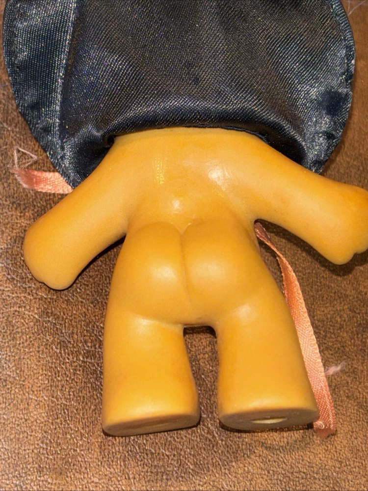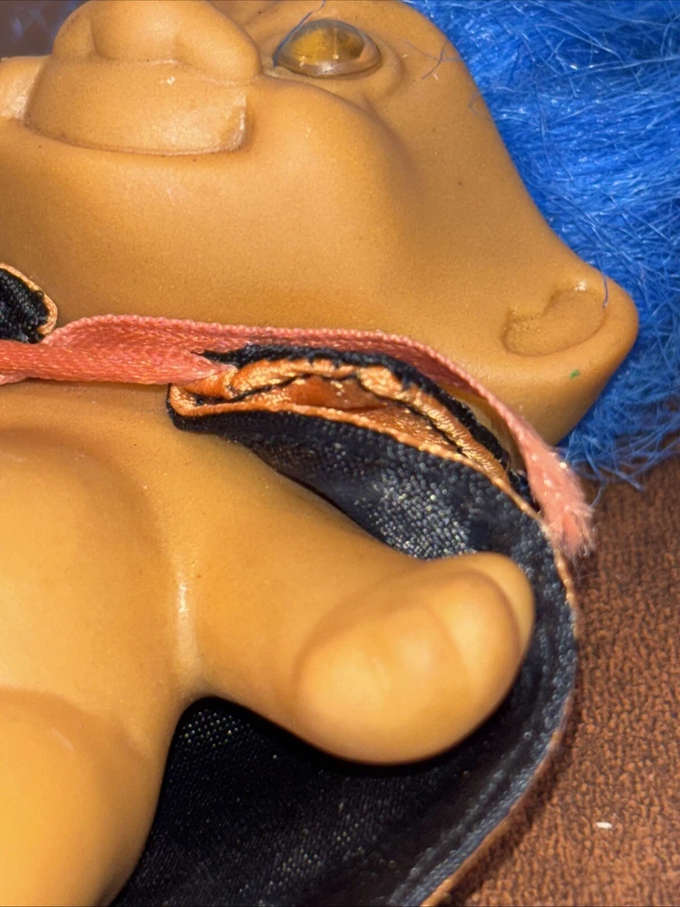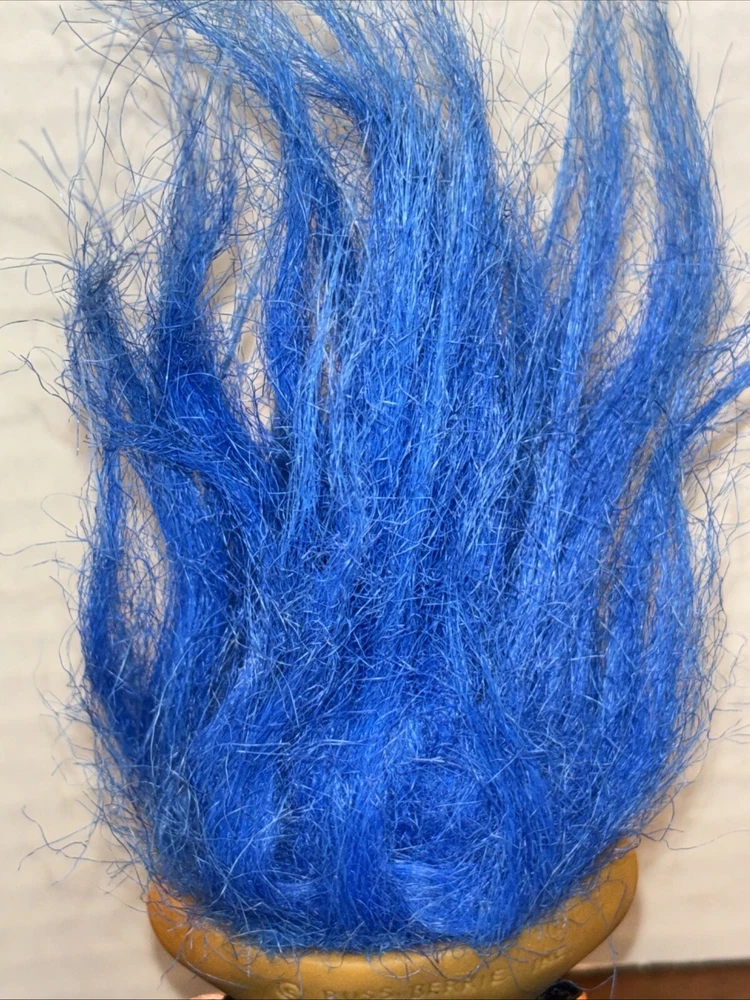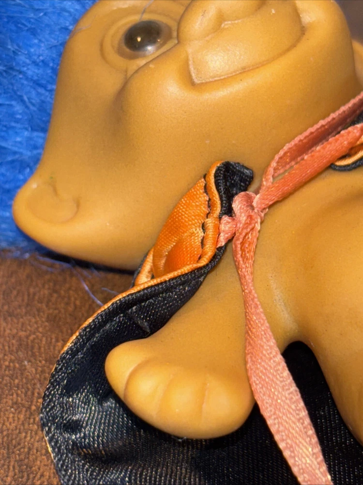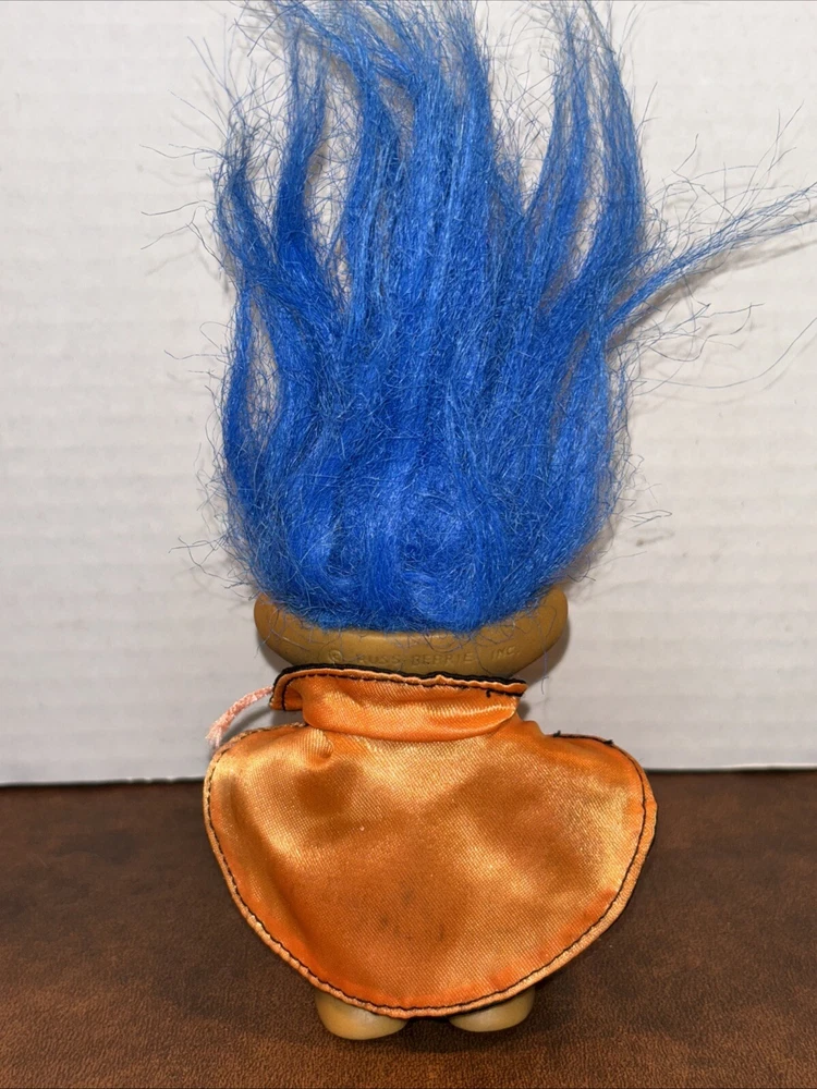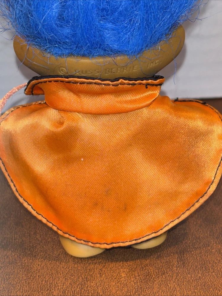 In pre owned excellent condition with very light signs of display ware to the body of the figure with light aging. The Hair is in excellent condition with no signs flaws or ware. Cape is in very good to excellent condition. With very light very faint marks to the back bottom of the orange side. No signs of damage or ware to the black side of the cape. The capes ties show light to light moderate signs of ware with light end edge fraying. (Pictured) Sold as pictured. This vintage 1990s Russ Berrie Troll Doll Figurine is a must-have for any collector or fan of the beloved Troll character. With its blue hair and pink doll hair color, this 3-inch doll is sure to stand out in any collection. The doll's brown eyes add a touch of realism to the overall design. This Troll doll comes with an outfit and is perfect for Halloween or any other occasion. The reversible cape adds an extra level of playability to the doll. Manufactured in the 1990s, this doll is a true gem for collectors looking for a piece of nostalgia.
