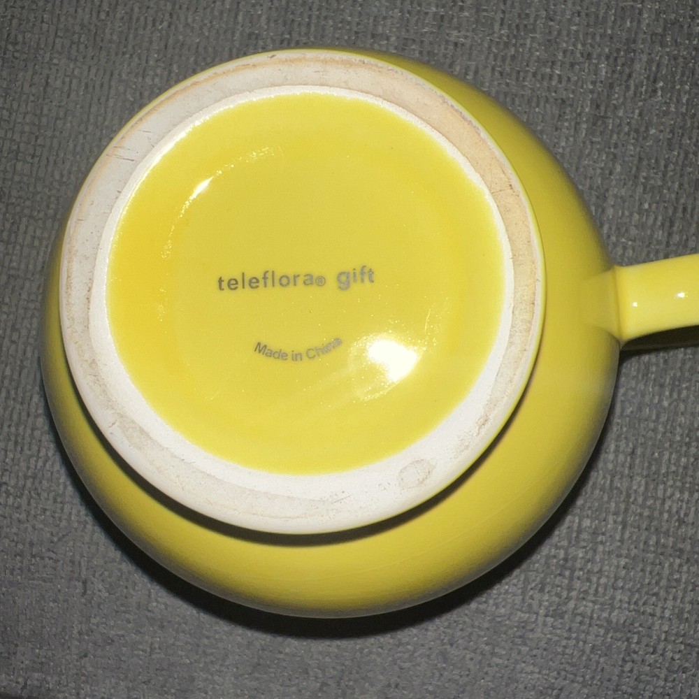 This vintage 1990s Teleflora Smiley Face Large 4" Retro Yellow Pottery Coffee Mug Cup is a charming and nostalgic piece of dinnerware. The round shape, large size, and bright yellow color make it a standout addition to any kitchen or collectibles collection. Made of pottery or ceramic, this coffee cup features a classic smiley face pattern, perfect for enjoying hot or cold beverages. This original piece from the 1990s exudes a retro style and is a unique find for those who appreciate vintage items. Made in China, this mug is a fun and quirky way to add a touch of retro flair to your daily routine.