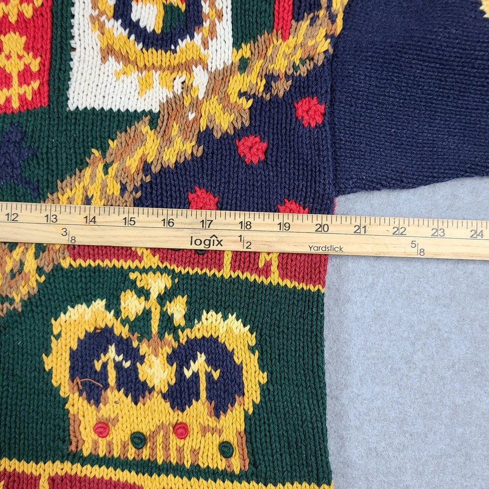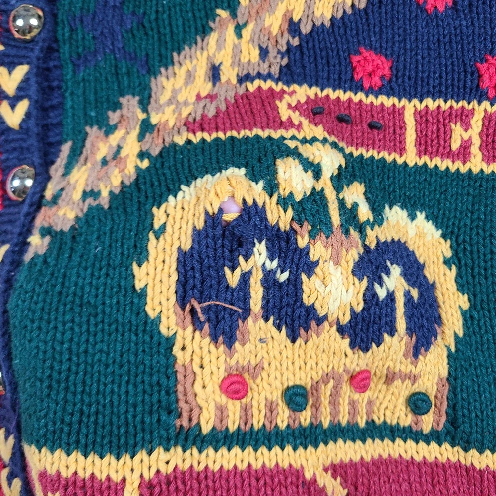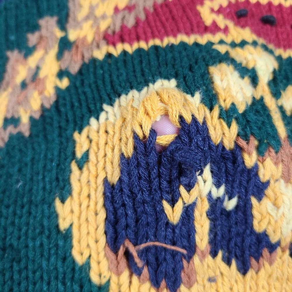 Small hole in front. Please see ALL pictures before purchasing. This vintage 1991 Eagles Eye Crown Royalty hand knit sweater cardigan is a must-have for any fashion-savvy woman. With its colorful, 90s-inspired design and heavyweight, shoulder-padded construction, this sweater is perfect for any occasion. The round neckline and collarless style add a touch of sophistication, while the button accents and knit fabric type give it a unique, vintage feel. Made from a blend of ramie and cotton materials, this sweater is easy to care for and should be hand washed only. It comes in a size M, with a regular fit and long sleeves. This sweater is perfect for anyone looking for a comfortable, stylish, and unique piece of clothing.