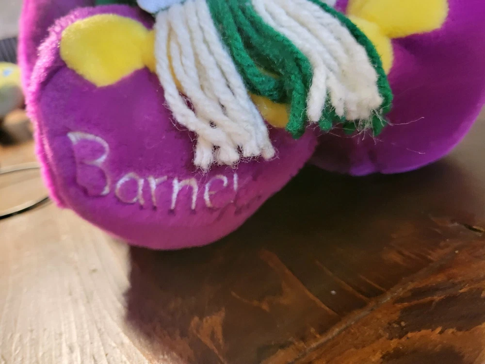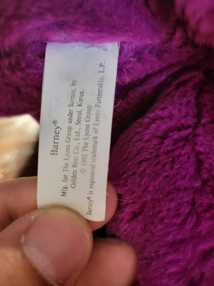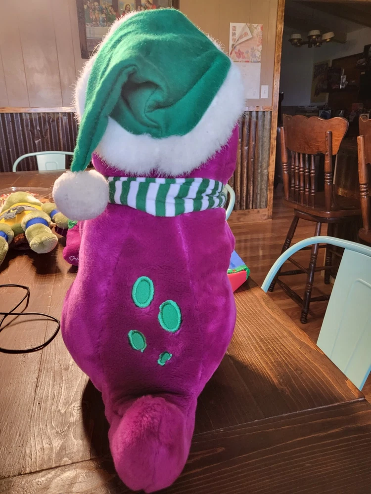 This is a vintage 16 inch plush Barney doll from 1992, featuring a Christmas theme. It is a stuffed animal toy that may be a collector's item for fans of the popular children's character.