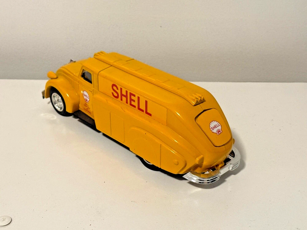 The vintage 1993 ERTL Shell Company of California Oil Tanker Truck Bank is a diecast model made in the United States. It is part of the American Classics series and features a yellow color scheme. This collectible toy vehicle is designed as an oil tanker truck and serves as a bank as well, making it a unique and versatile addition to any collection. Perfect for both boys and girls, this ERTL truck captures the nostalgia of classic American toy vehicles from the early 1990s.