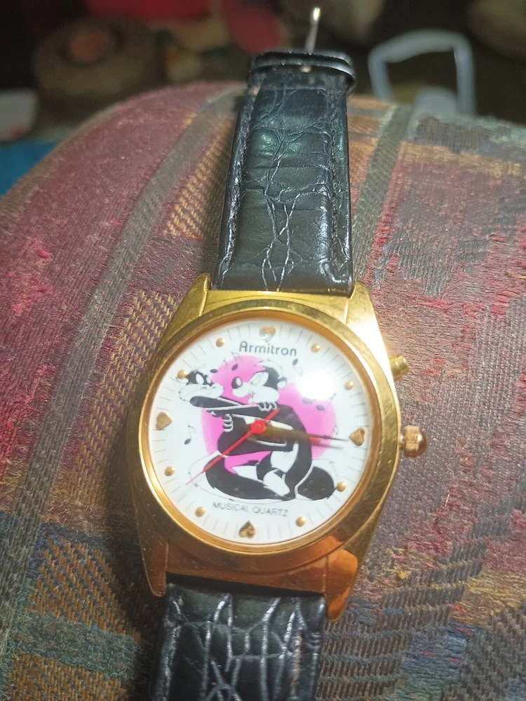 Type:WristwatchVintage:YesTheme:MusicDepartment:Unisex AdultsDisplay:AnalogFranchise:Looney TunesYear Manufactured:1995Character:Pepe Le PewBand Color:BlackMovement:QuartzModel:Armitron Pepe Le PewBrand:ArmitronDial Color:WhiteCase Color:GoldStyle:1980sFeatures:MusicalTime Period Manufactured:1990-1999