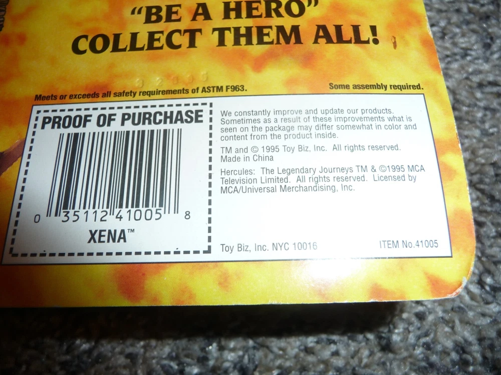 This is a New in Box Hercules The Legendary Journeys Xena Warrior Princess Figure. It is from 1995 and it is in great condition! The packaging and card are pretty great for almost 30 years old! It is made by Toy Biz and it looks like I could have just pulled it off the shelf in 1995! Please see the photos!