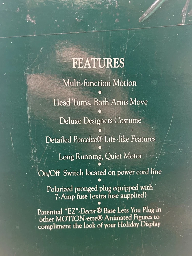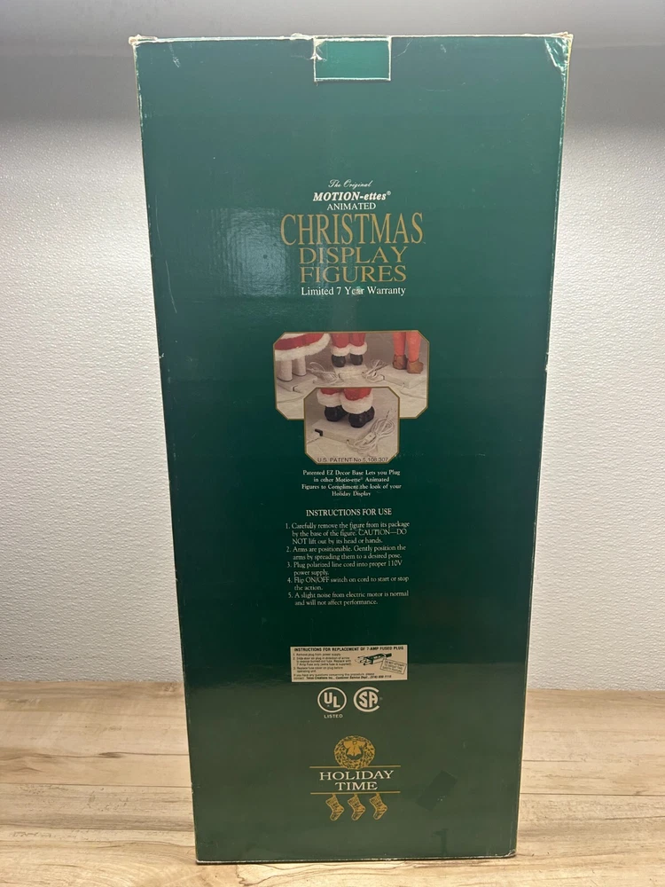 Vtg 1995 Holiday Time Christmas Motion-ettes 25" Working Santa Moving Dispay.This is moving Santa only-no music,no lights.In very good used condition-no broken or missing parts,no stains.In original box-the box is not in great condition-please see all pictures for condition details WE OFFER COMBINED SHIPPING AND MULTI-ITEM PURCHASE DISCOUNTS.IF YOU HAVE ANY QUESTIONS, PLEASE LET US KNOW
