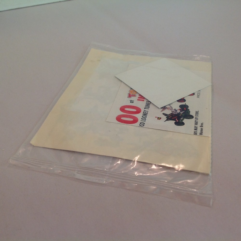 You are bidding on this Vintage 1995 Kraft Foods Sticker Set Looney Tunes Toys R Us Coupon Tyco Sealed These are vintage N(ew) O(ld) S(tock) items, in good used NOS condition; stickers are still in their original packaging, which has not been opened and shows light rubbing to plastic wrap. Overall quality appears unused; smooth/glossy, with good preservation of color/sheen and graphics still sharp/bright. There are no excessive nicks, chips, rips, tears, perforations, stains, residue or repairs. The sticker sheets in packaging measure approx 6" x 4.25". Thanks for looking and please see our other items up for auction. LOTS more in our EBay store, all items BIN and most with Make Offer options. Auction style items transfer to Ebay store in the event of ending without bids. Michigan residents will pay 6% sales tax. PLEASE NOTE WE WILL NOT END AUCTIONS EARLY!! ALSO, Please understand that we will not adjust product prices on international shipping in order for you to pay a cheaper Customs Fee - by doing that if there is an issue with you receiving this this or any of our items or it arrives damaged - I would only be able to claim what is on the Customs paperwork. ALL CUSTOMS FEES WILL BE PAID BY BUYER - WE WILL NOT BE RESPONSIBLE FOR ANY CUSTOMS FEES. It is also fraud to alter federal paperwork. All retur ns must be returned in the same condition in which it was received.