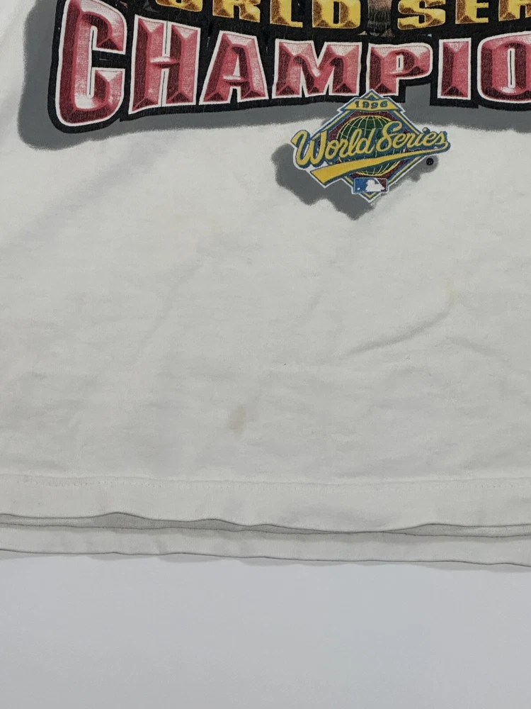 Vintage 1996 New York Yankees World Series Men's Champions Starter T-Shirt Size XL Kinda decent - to - okay condition overall - see ALL photos very closely Shirt has heavy discoloration stains/ fade throughout both sides - around collar - little stains/marks throughout front side around graphic couple little spots - back side has stain spot too - see ALL photos very closely for condition Will ship with care