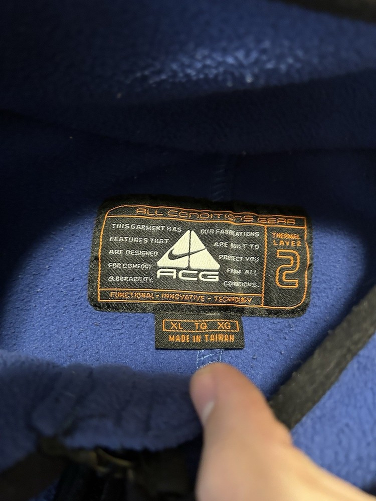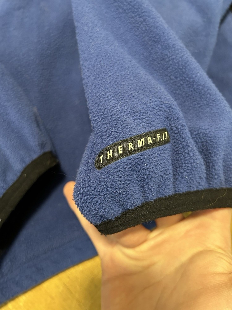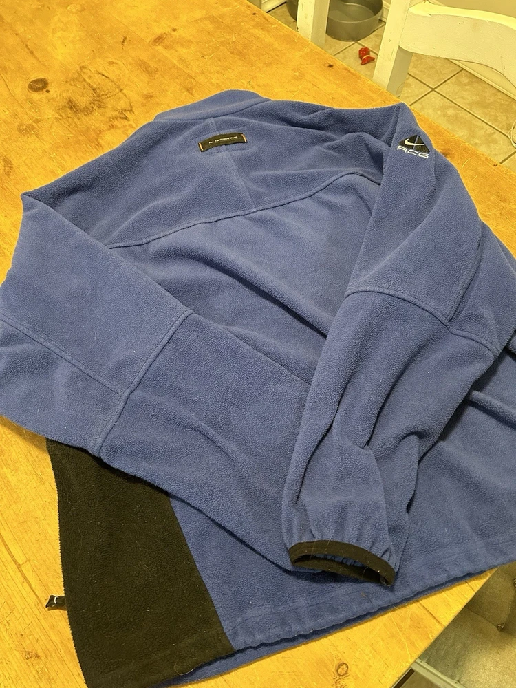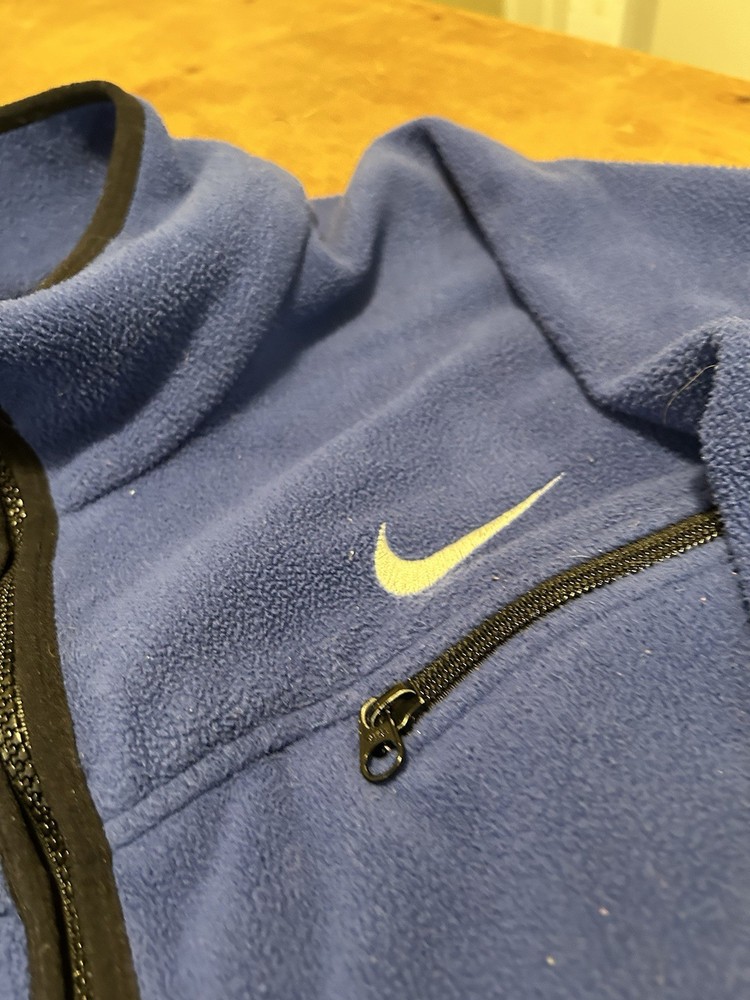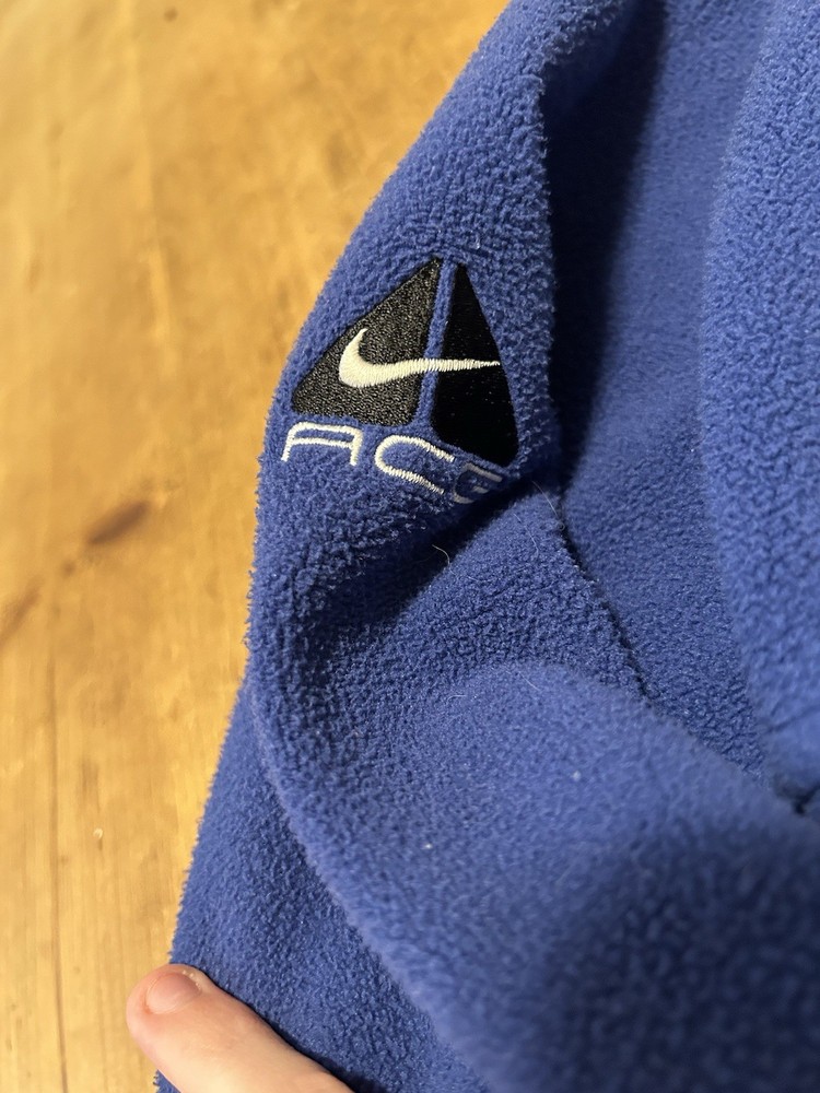 This Vintage 1997 Nike ACG Blue 1/2 Zip Pullover Fleece Jacket is a stylish and comfortable activewear piece for men. Made of polyester fleece, this solid blue jacket features a zip closure, logo accents, and pockets for added functionality. Perfect for outdoor activities or a casual 90s sports-inspired look, this jacket is ideal for all seasons and is a great addition to any man's closet.
