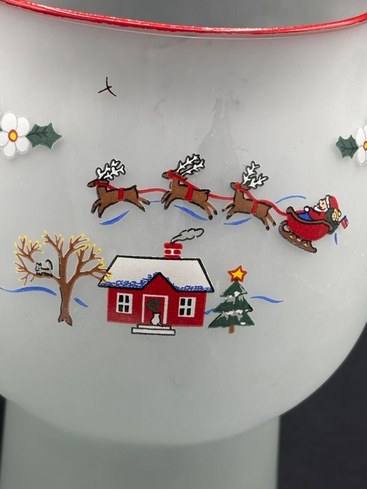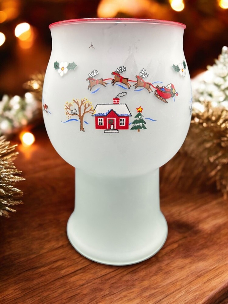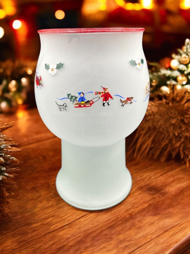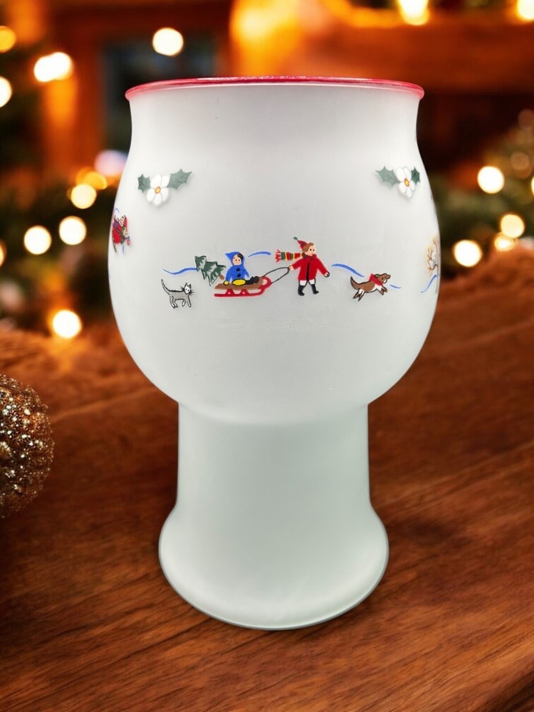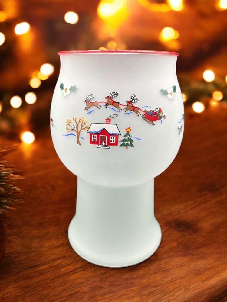 Room: Any Room Item Height: 8 in Color: Multicolor Antique: No Finish: Frosted Subject: christmas village Size: Medium Original/Reproduction: Original Handmade: No Material: Glass Occasion: Winter Brand: Pfaltzgraff Type: Candle Holder Theme: christmas