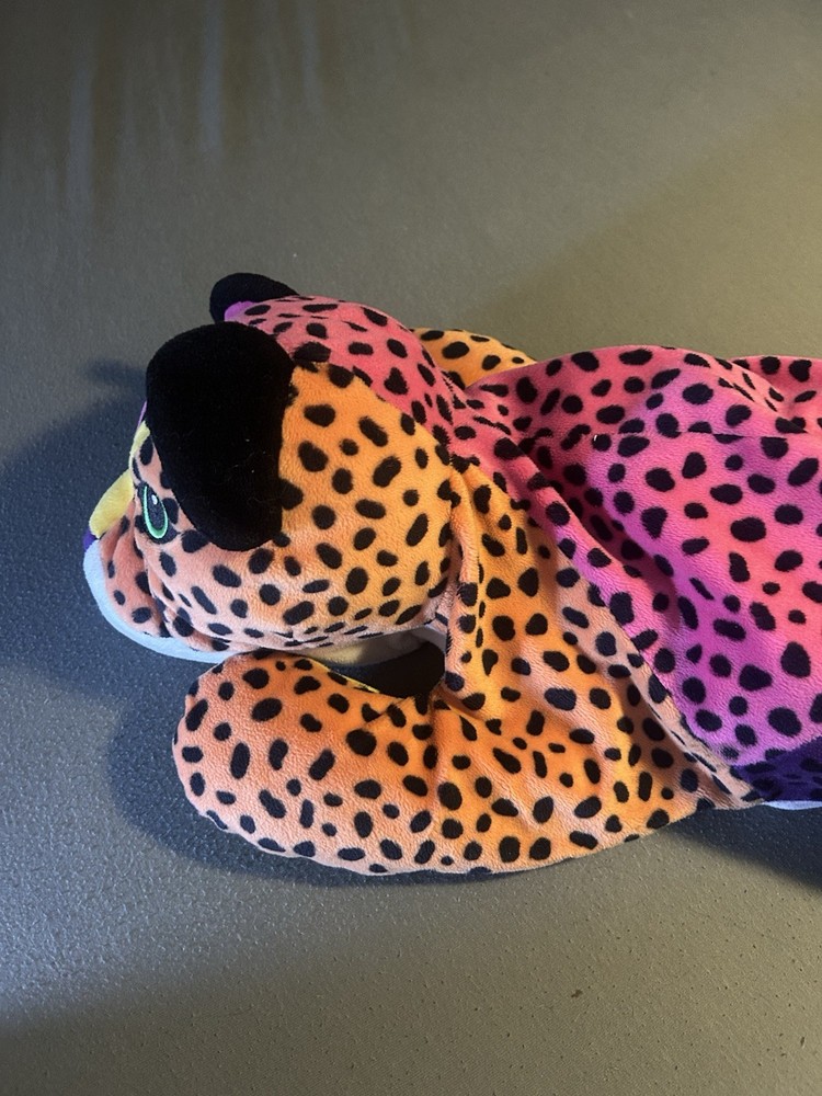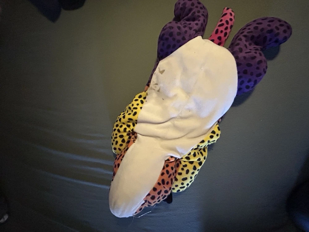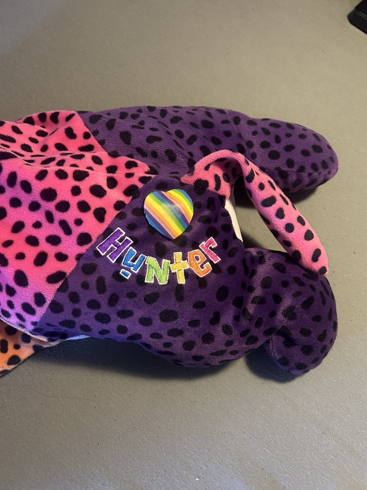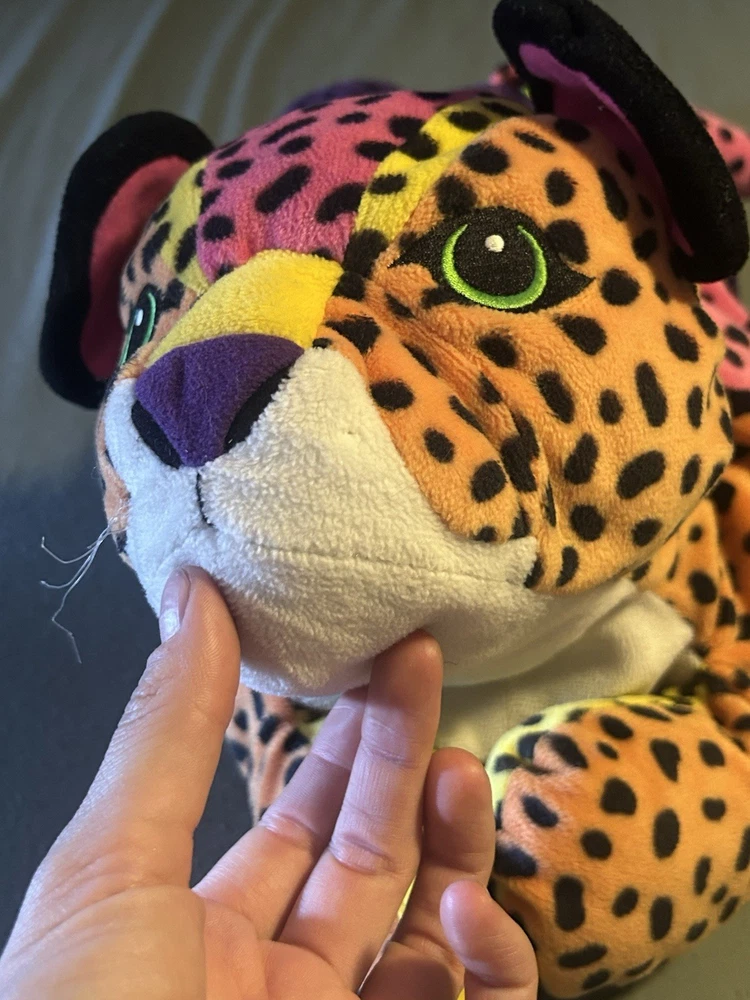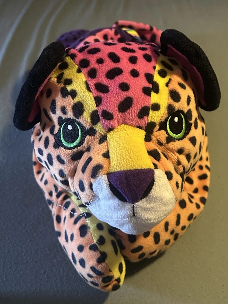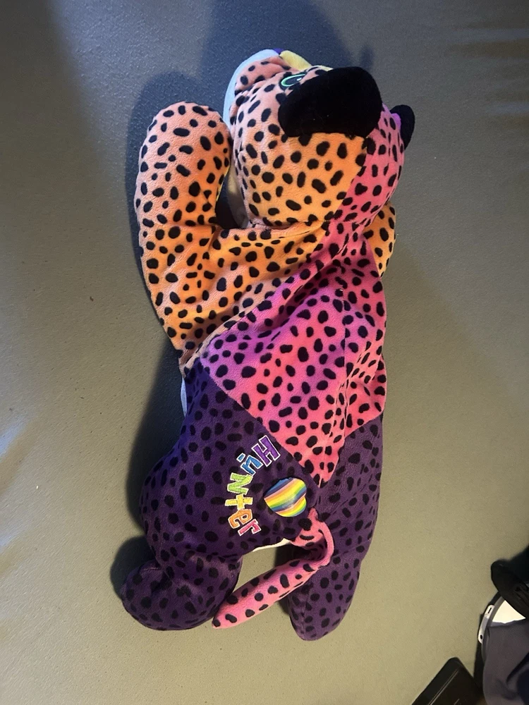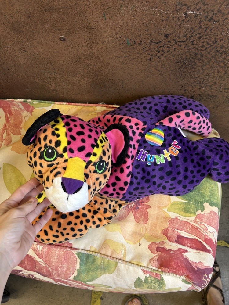 Please read! Vintage Lisa Frank “Hunter” the Rainbow Leopard plush from the late 1990s. This is the large size (approximately 24 inches long) and features the classic bright neon colors and spotted pattern Lisa Frank is known for. Condition is pre-owned. There are visible stains on the white belly area (see photos), and it does not have original tags, there is a small stitch that is loose on the belly as well creating a small hole. Still displays well and would be a great collectible or nostalgic piece. It is a bit deflated and missing whiskers on one side of the face. See pictures for details! Details: Character: Hunter the Leopard Brand: Lisa Frank Approx. size: 24 inches Era: 1990s (1998) Color: Multicolor rainbow with black spots