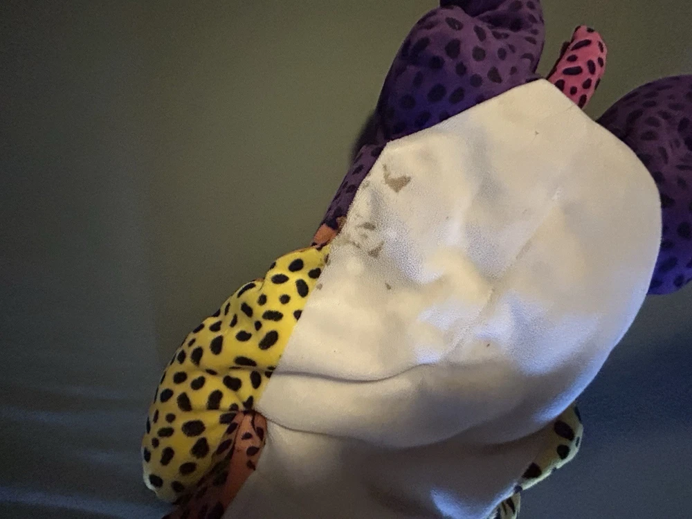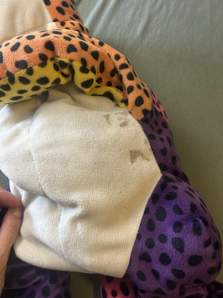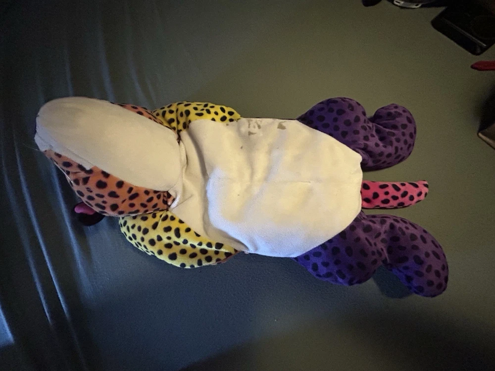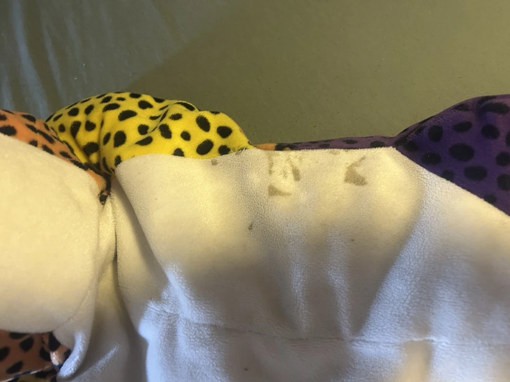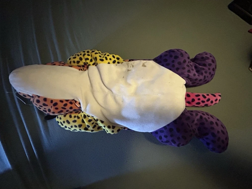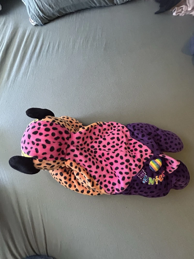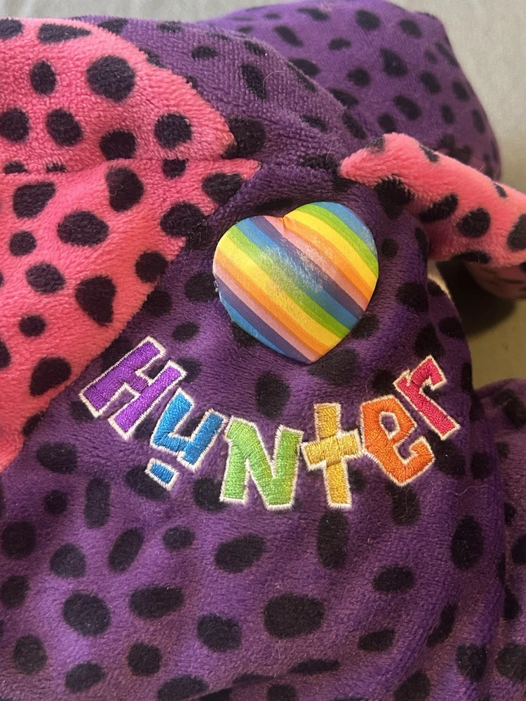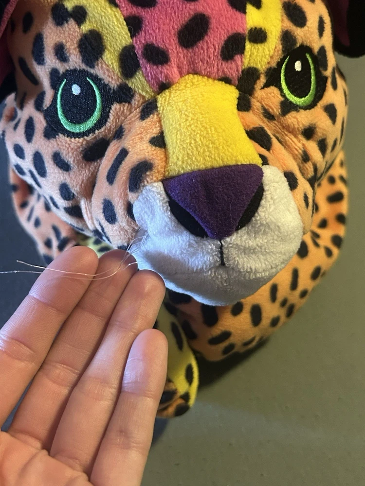 Please read! Vintage Lisa Frank “Hunter” the Rainbow Leopard plush from the late 1990s. This is the large size (approximately 24 inches long) and features the classic bright neon colors and spotted pattern Lisa Frank is known for. Condition is pre-owned. There are visible stains on the white belly area (see photos), and it does not have original tags, there is a small stitch that is loose on the belly as well creating a small hole. Still displays well and would be a great collectible or nostalgic piece. It is a bit deflated and missing whiskers on one side of the face. See pictures for details! Details: Character: Hunter the Leopard Brand: Lisa Frank Approx. size: 24 inches Era: 1990s (1998) Color: Multicolor rainbow with black spots