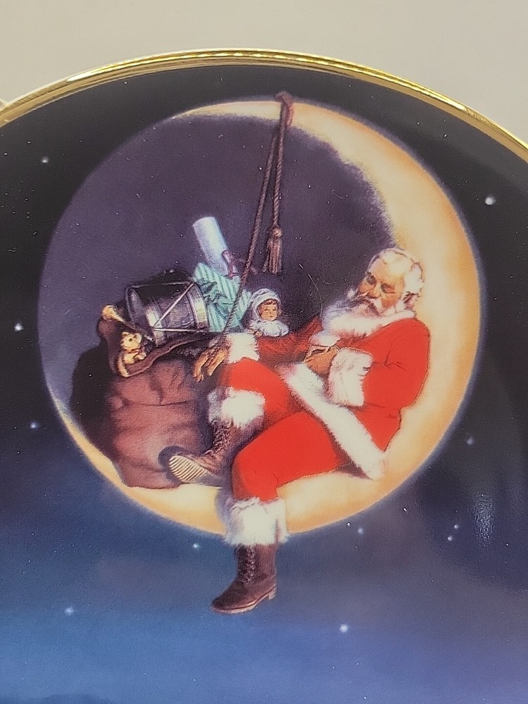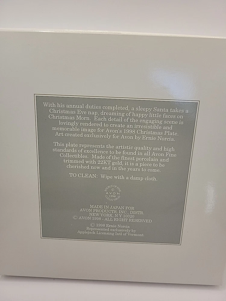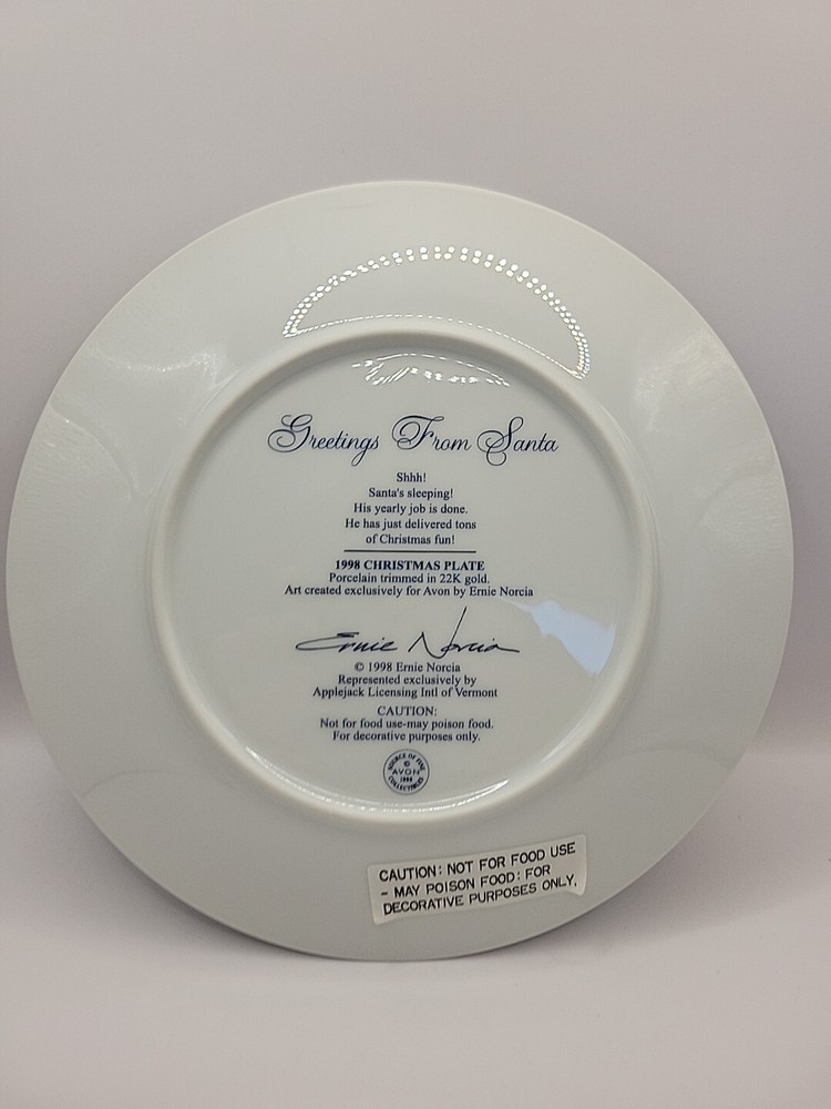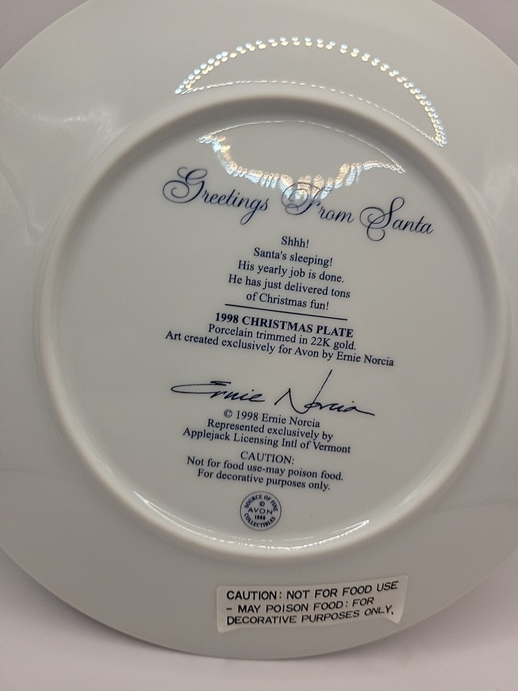 This Christmas collector plate features a beautiful winter scene with a sleeping moon and the words "Greetings From Santa" inscribed on it. The plate has a diameter of 8 inches and is made by Avon, a well-known brand in the collectibles industry. This decorative piece is perfect for any Christmas occasion and will make a great addition to any collection. The plate was manufactured in China and is part of the Avon product line. It is a multicolor collector plate that is sure to catch the eye of anyone who sees it. The California Prop 65 Warning does not apply to this item. This is a must-have for any collector of decorative plates, and it makes a great gift for anyone who loves Christmas decor.