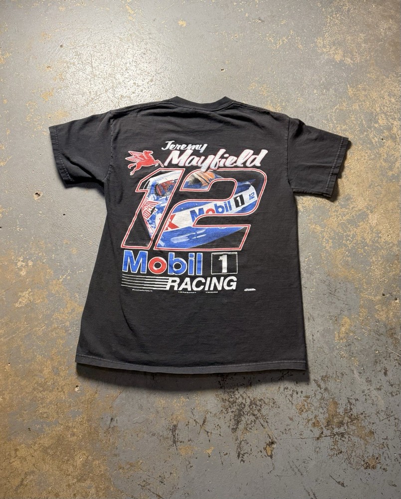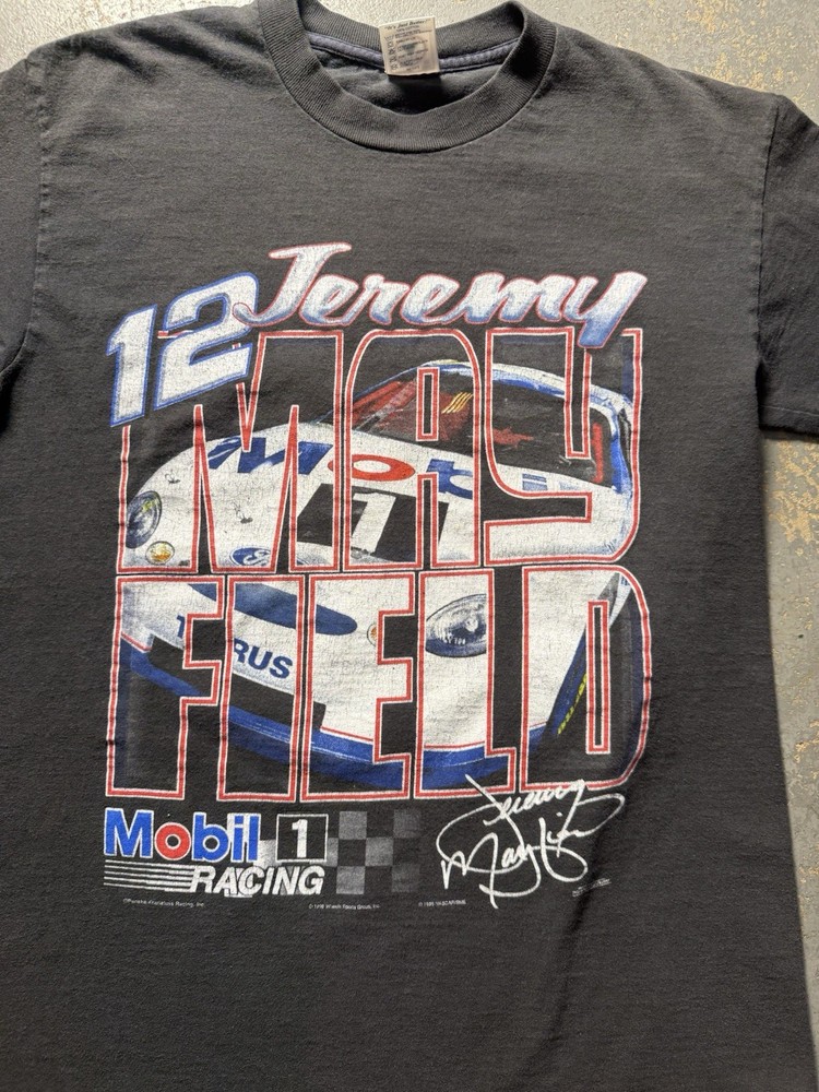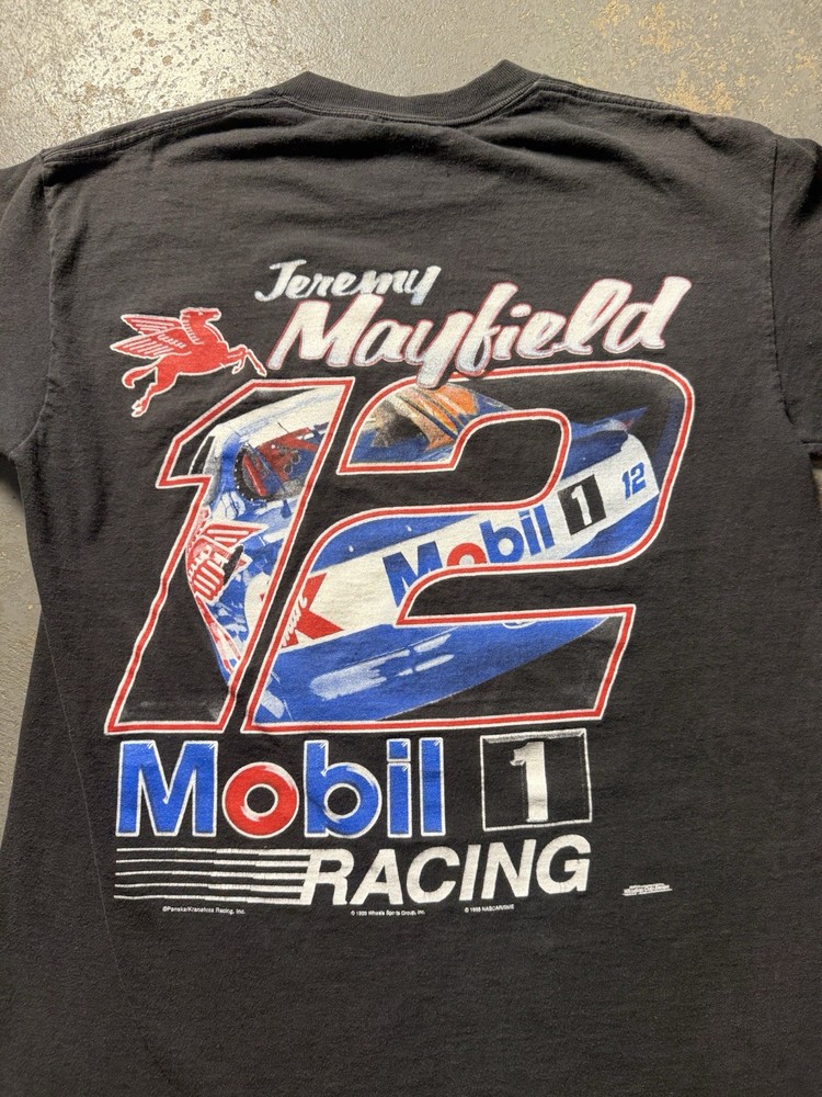 Vintage 1998 NASCAR Jeremy Mayfield Mobil Racing Black Graphic Shirt-Size Medium. Condition is Used. Shipped with USPS Ground Advantage.