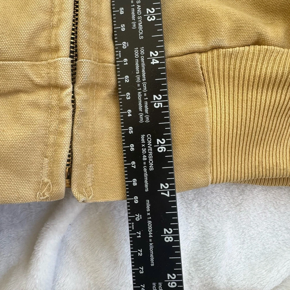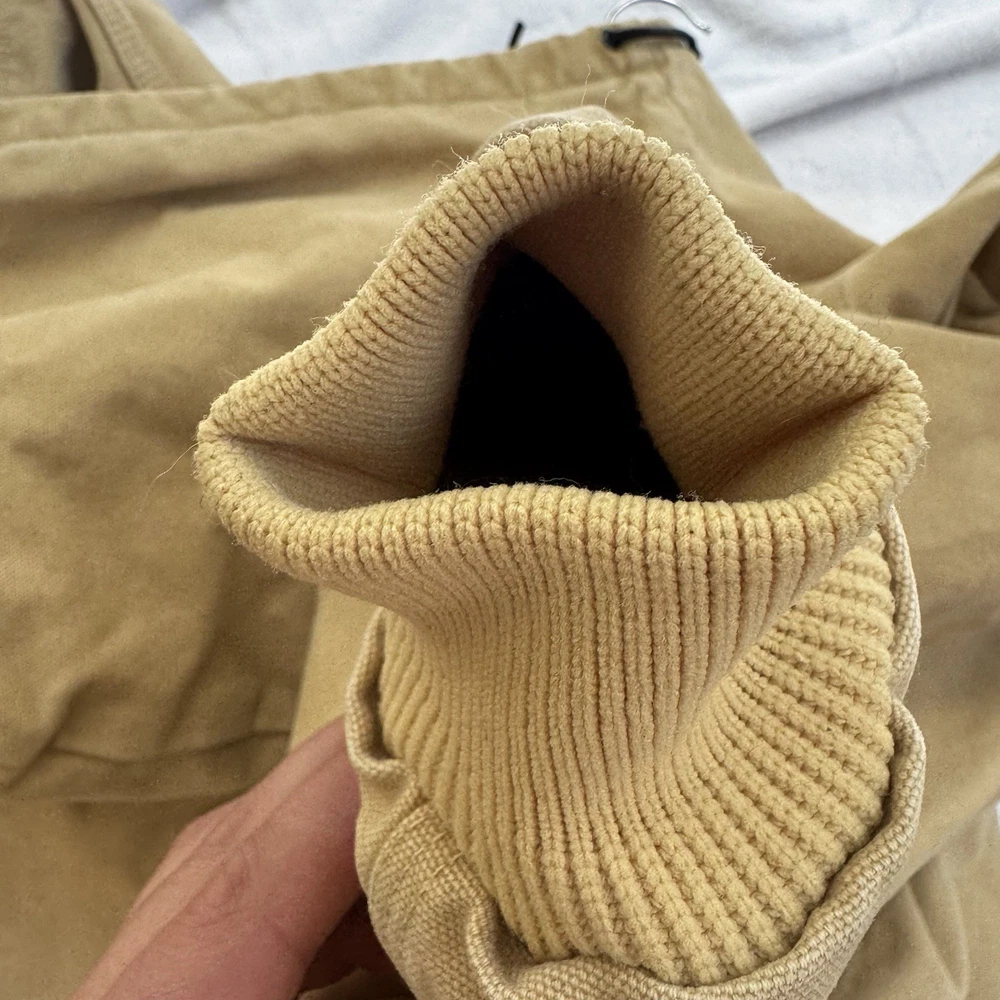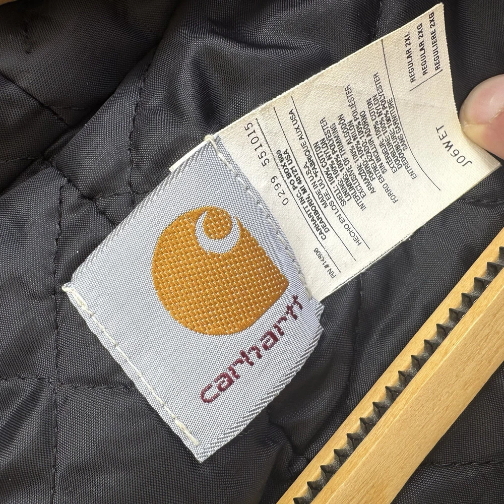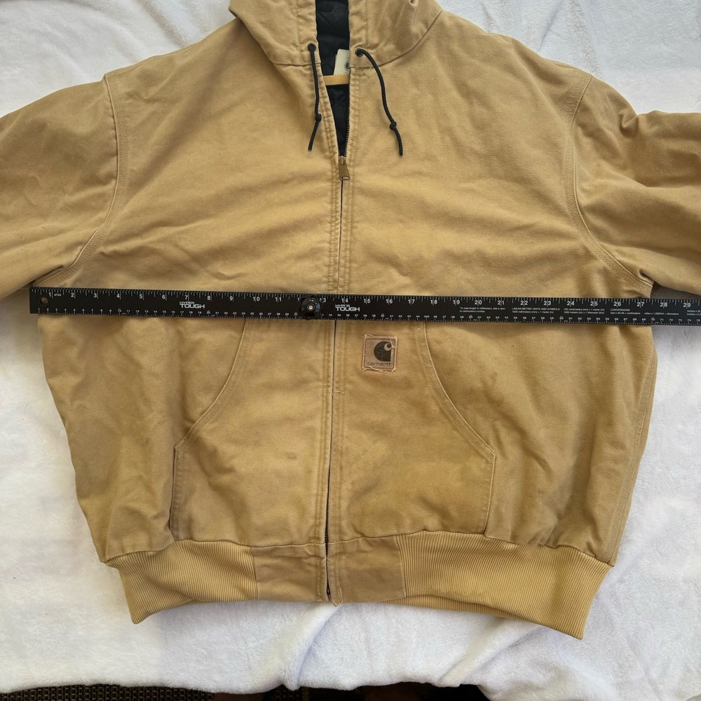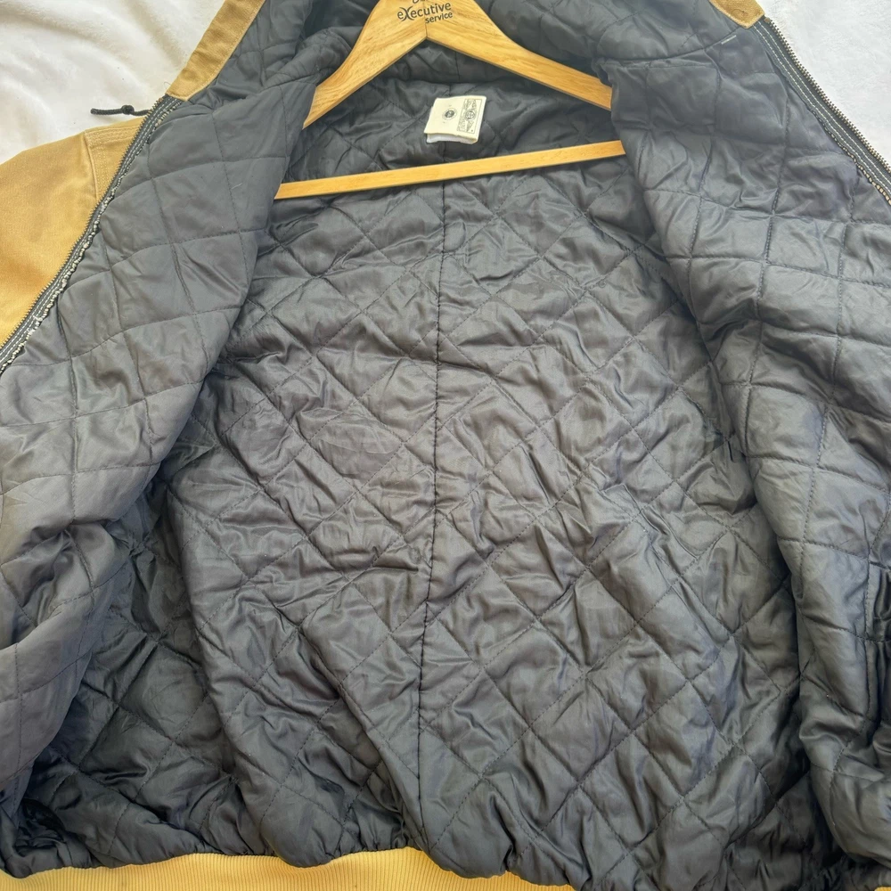 Up for sale is a classic Carhartt work coat in a beautiful beige color. This vintage jacket features a sturdy cotton canvas outer shell, with a quilted nylon lining and polyester insulation to keep you warm. The jacket is hooded, has a button closure, and is designed for regular fit. This Carhartt work coat is perfect for casual occasions, with accents that give it a unique vintage look. It is a USA union made garment, and is available in size 2XL. The jacket is suitable for fall, winter, and spring seasons, and is ideal for hunting and other outdoor activities.