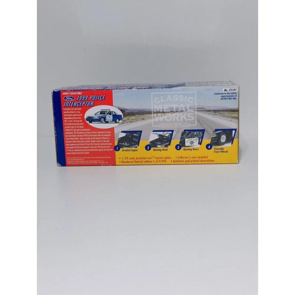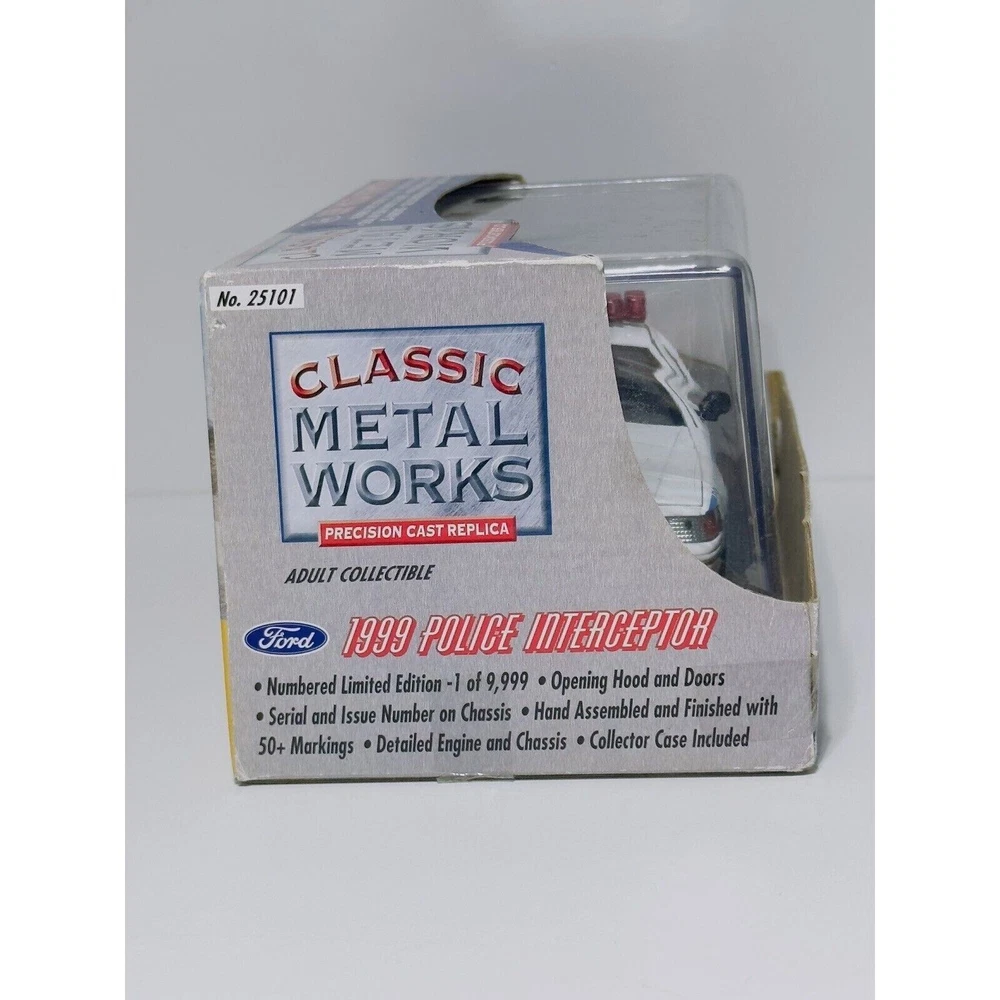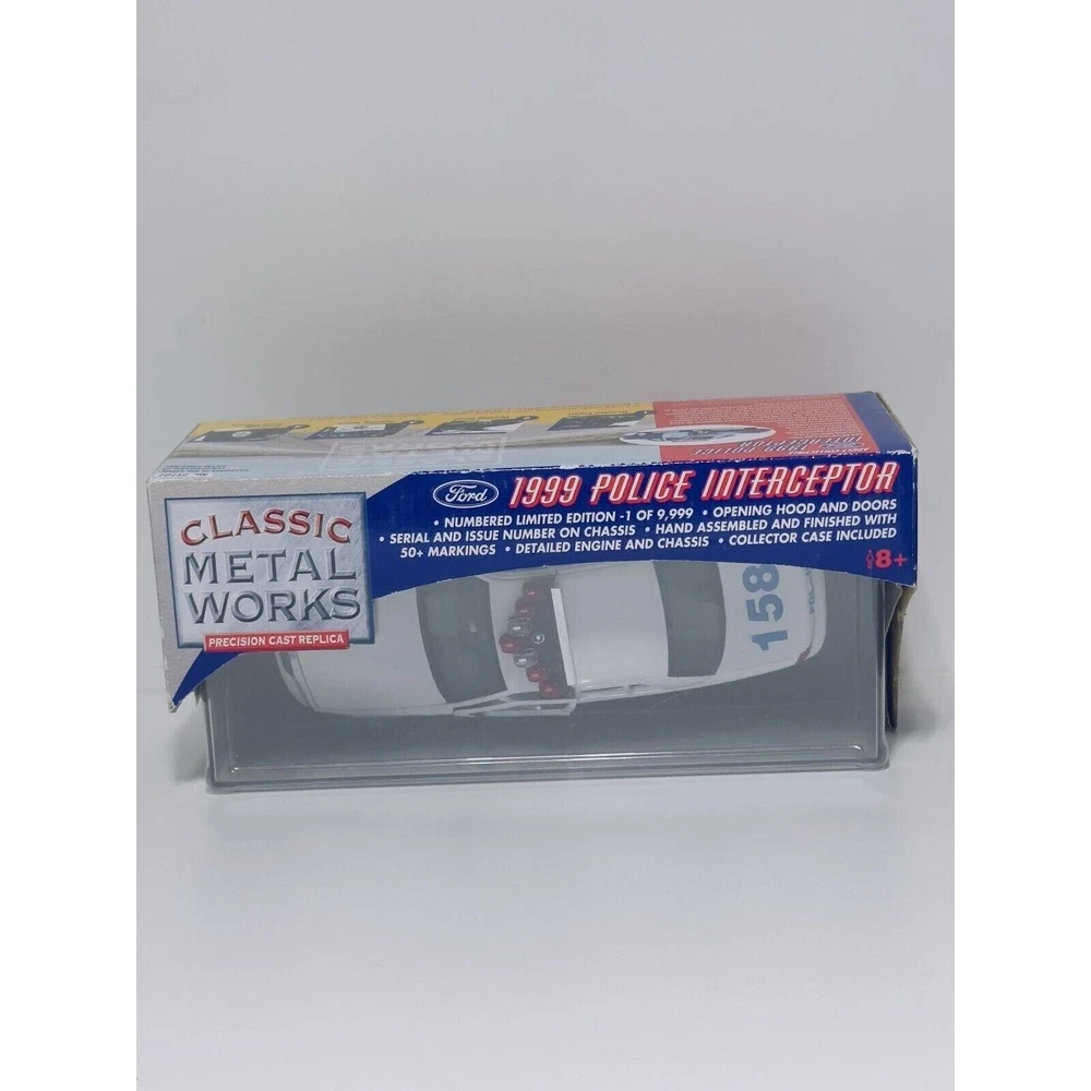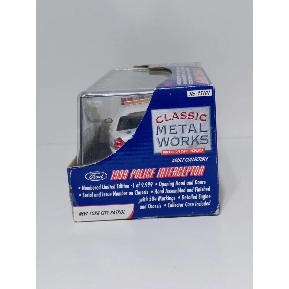 This 1999 Classic Metal Works Ford Police Interceptor 1:24 diecast model is a must-have for any police car collector. The white Ford Crown Victoria Police car is from the D.A.R.E. Cook County Sheriff series and features the limited edition badge. It is a vintage model and perfect for both display and play. The vehicle make and model is Ford Police Interceptor and it is a 1:24 scale model. The color of the car is white and it is a part of the contemporary manufacture diecast and toy vehicle collection. The car is not customized and is in its original condition. This collectible does not come with autographs and is a great addition to any police-themed collection. Very Minor shelf wear in box (check photos for condition