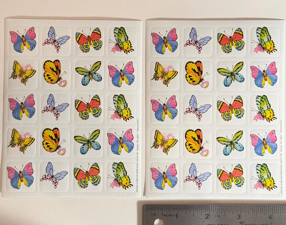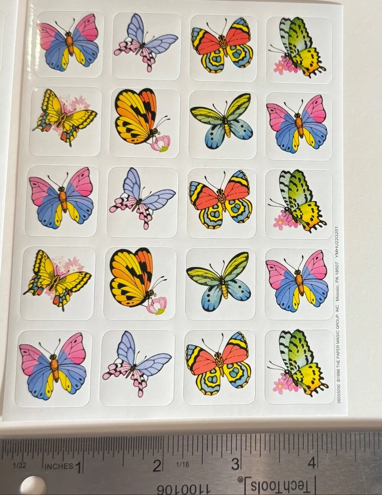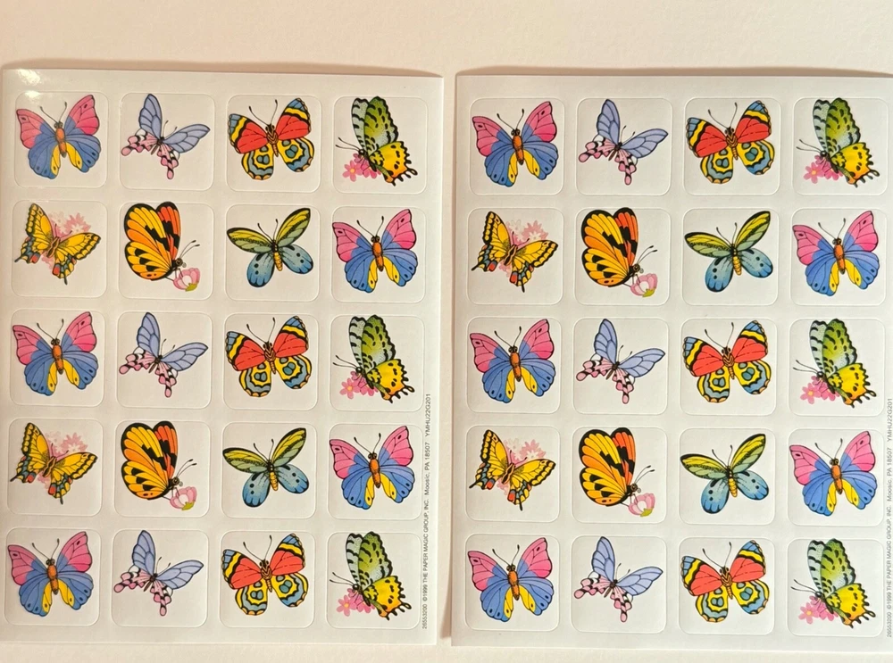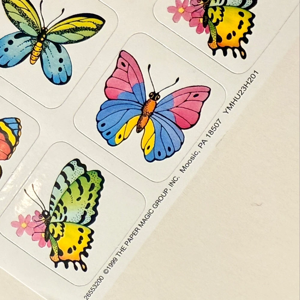 Unearth the Magic of nostalgia with this Vintage 1999 Glossy Sticker Sheet featuring a whimsical butterfly theme. Includes: 2 New Full Sheet Qty. 40 Stickers