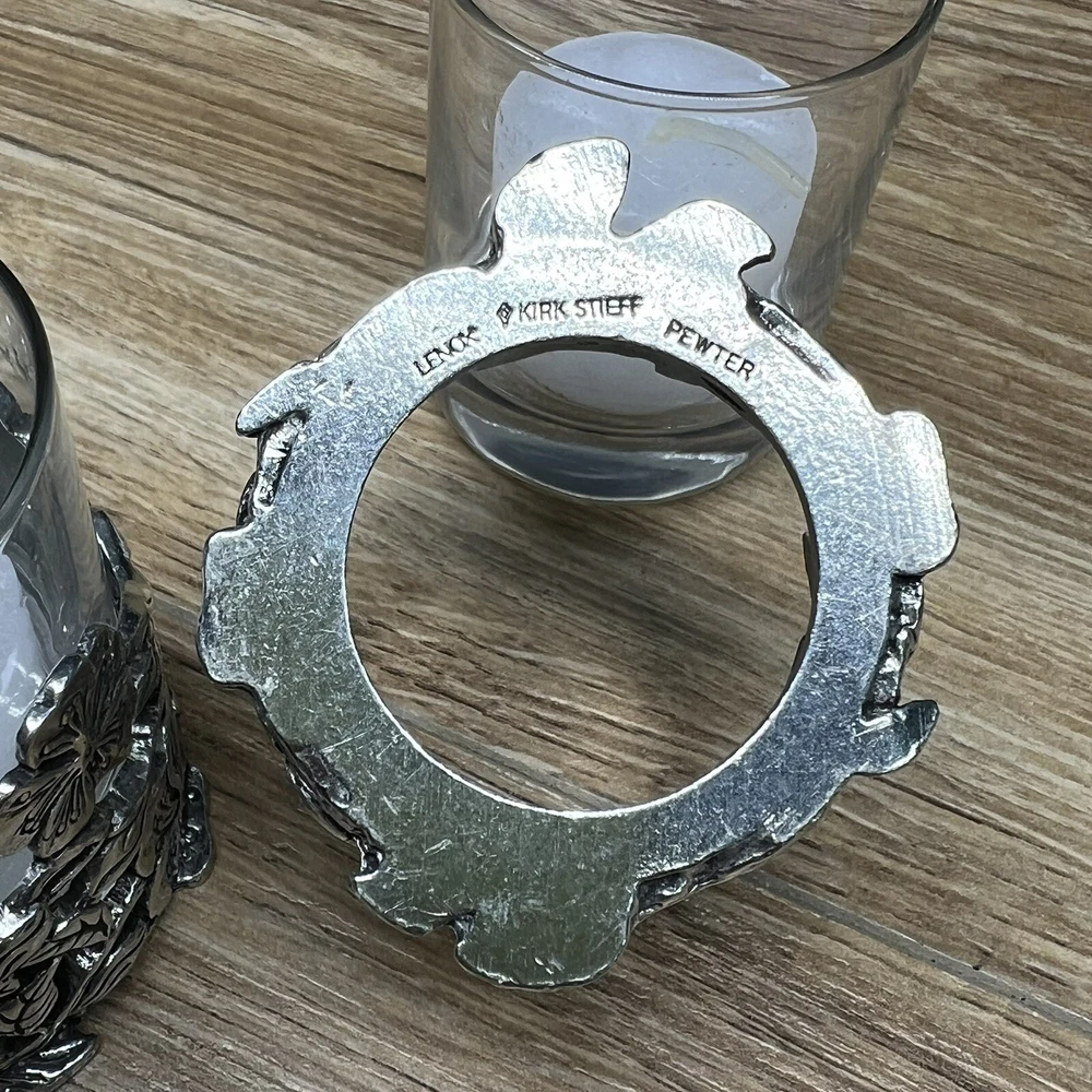 This vintage Lenox Kirk Stieff candle holder set includes two small round pewter candle holders with a silver matte finish. Each holder measures 2 inches in height, 2 inches in length, and 2.5 inches in width. The design features a floral motif, making it suitable for all occasions and adding a touch of elegance to any decor. Perfect for collectors or as decorative pieces in a home setting.
