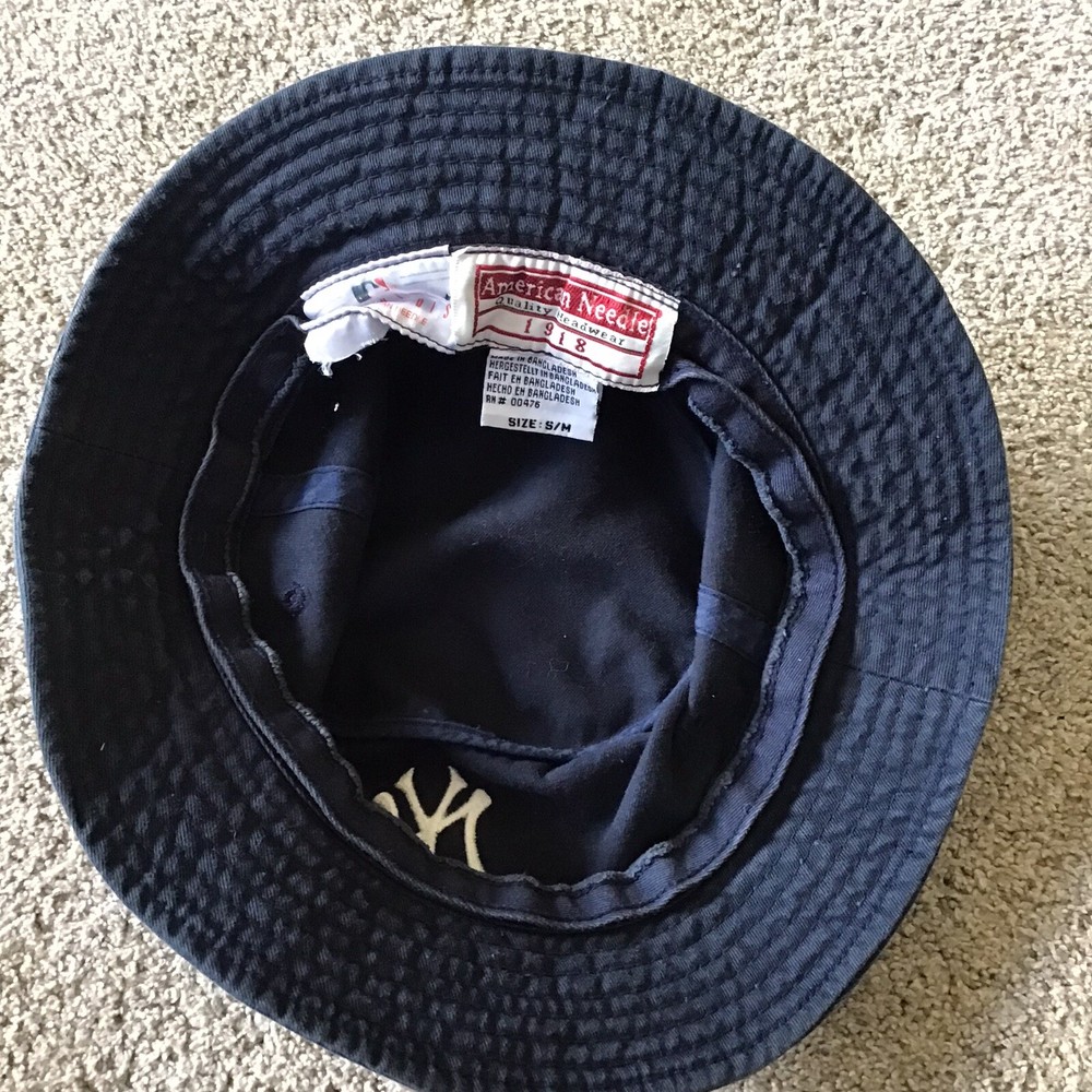 Vintage 2000s American Needle New York Yankees Bucket Hat in blue, size Men's S/M. This classic baseball cap features the iconic New York Yankees logo, making it a must-have for any fan of the team or collector of sports memorabilia. With its new with tags (NWT) condition, this hat is the perfect addition to any fan apparel collection.