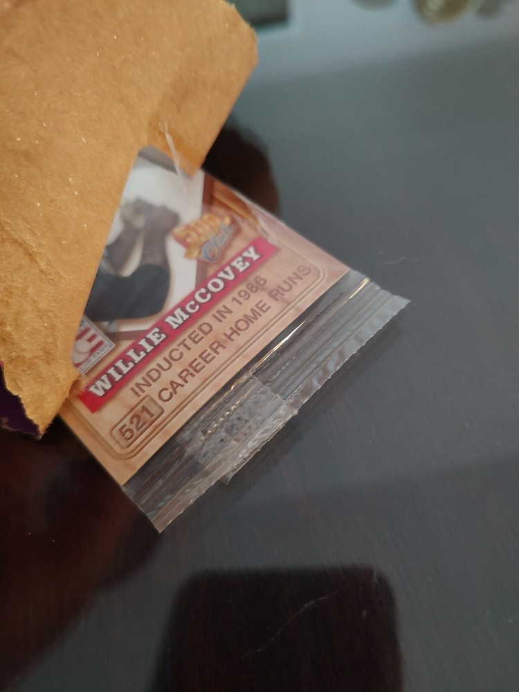 This limited edition trading card pack features two baseball legends, Willie McCovey and Reggie Jackson, who both have over 500 HRs. The cards are from the 2001 Topps Post set and come in a cereal box insert, seen in the picture. The card size is standard and made of card stock material. The card is an original and collectors edition with features like being a promo and an insert. Manufactured by Topps in the United States. This sports trading card is a must-have for any collector and celebrates the 500 HR Club.