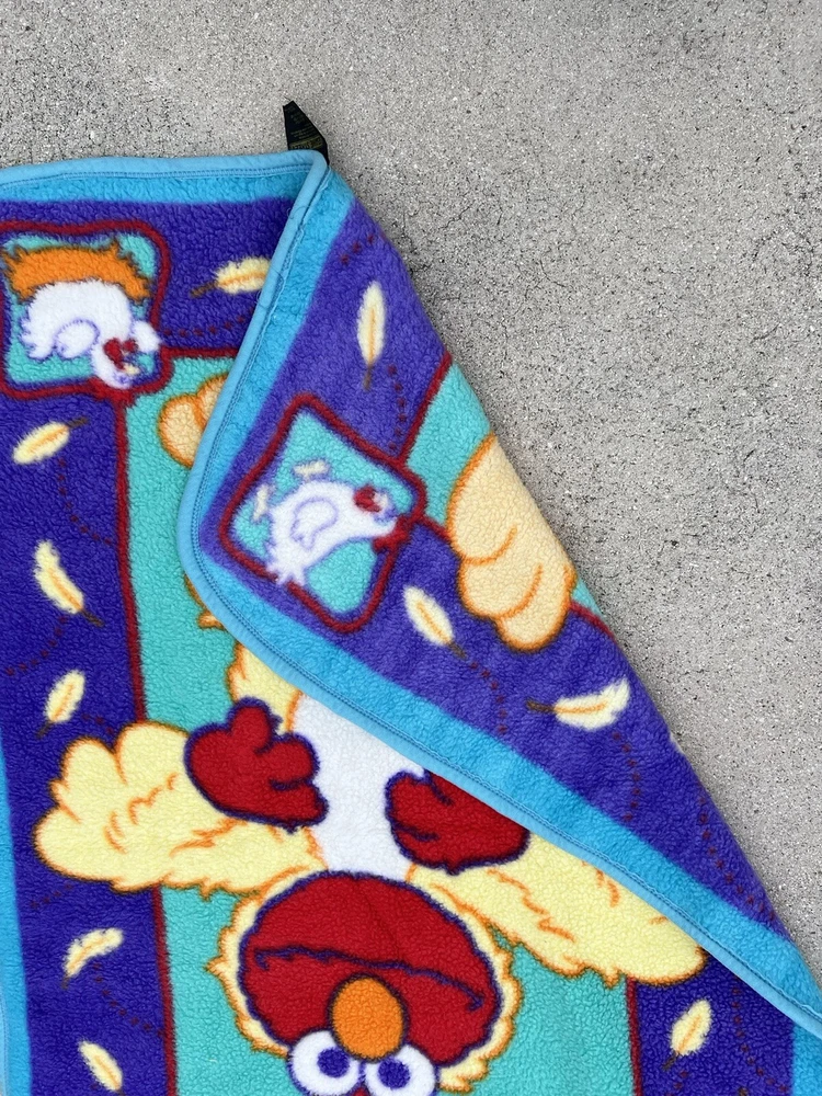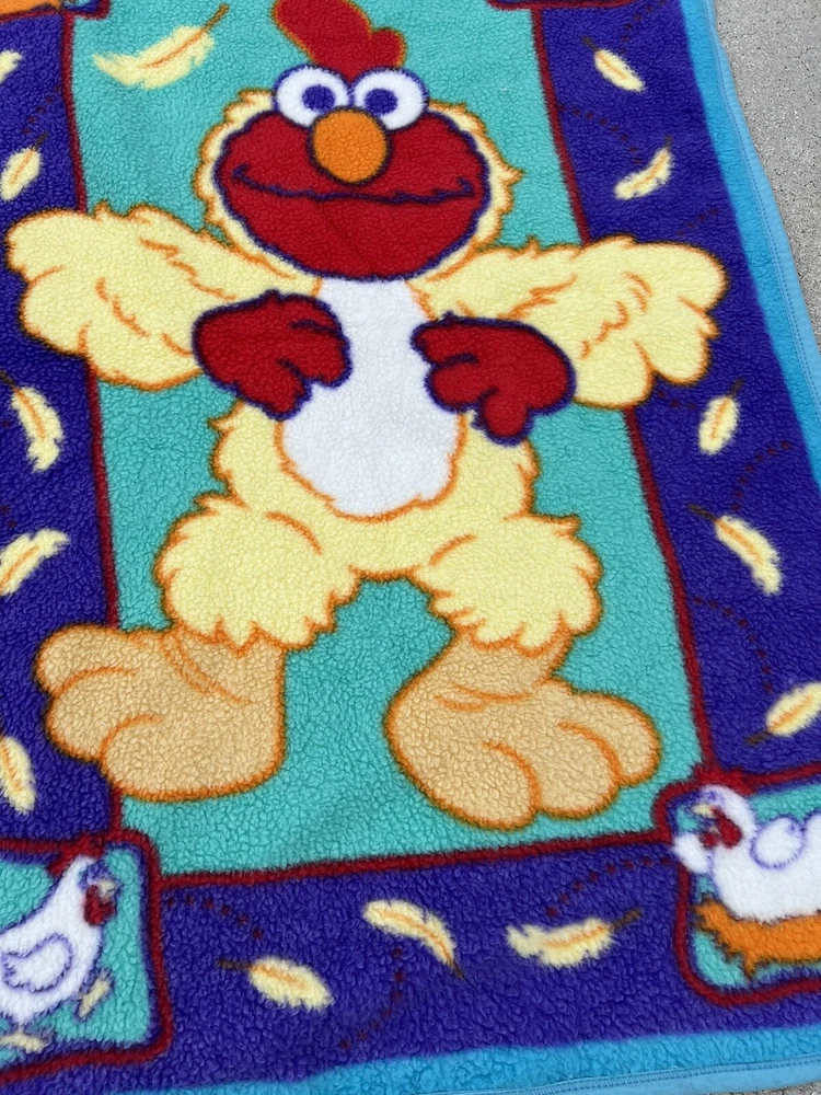 This vintage 2002 Sesame Street Elmo Chicken Blanket is a must-have for any fan of the beloved children's show. Made of soft fleece material, this multi-purpose blanket is perfect for snuggling up with your little one during nap time or as an extra layer of warmth during chilly nights. The blanket features a colorful design of chickens and the iconic Elmo character, making it a fun addition to any baby's nursery. Measuring 30x43 inches, this blanket is the perfect size to fit most standard cribs. It is also easy to care for, making it a practical choice for parents who want a cozy and comfortable option for their babies. This blanket is a great gift for any baby or young child who loves Sesame Street and comes from a trusted brand, Owen.