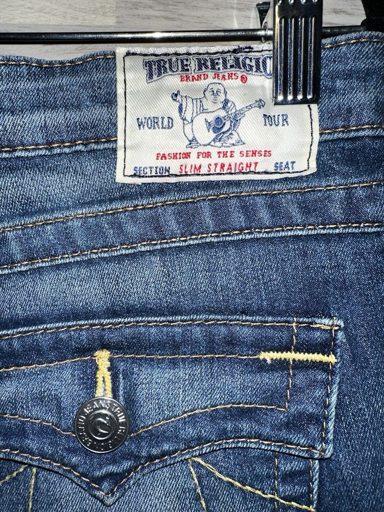 This pair of vintage True Religion jeans is a must-have for any fashion-forward man. The medium wash denim with a solid pattern and button closure is perfect for any season, be it winter, summer, fall, or spring. Made of high-quality cotton with a denim fabric type, these jeans are both comfortable and durable. Featuring a slim straight fit and a 32-inch waist size, these jeans are designed to flatter your figure. The zipper accents, preppy logo theme, and slimming features make these jeans the perfect addition to your wardrobe. Made in the United States in 2003, these jeans are a rare find that will surely turn heads.