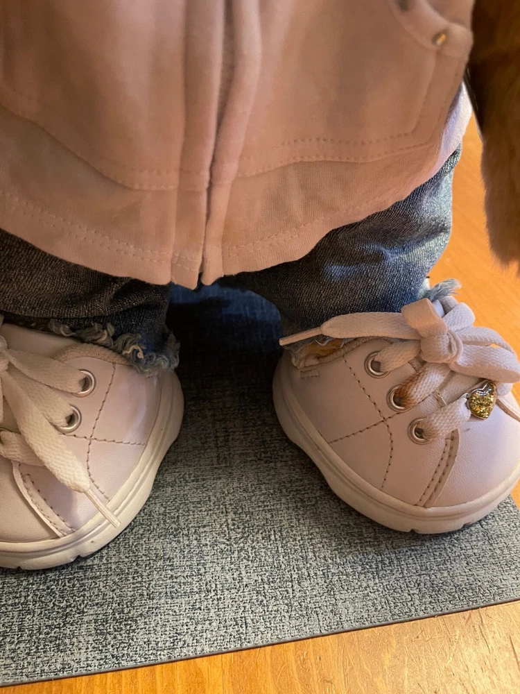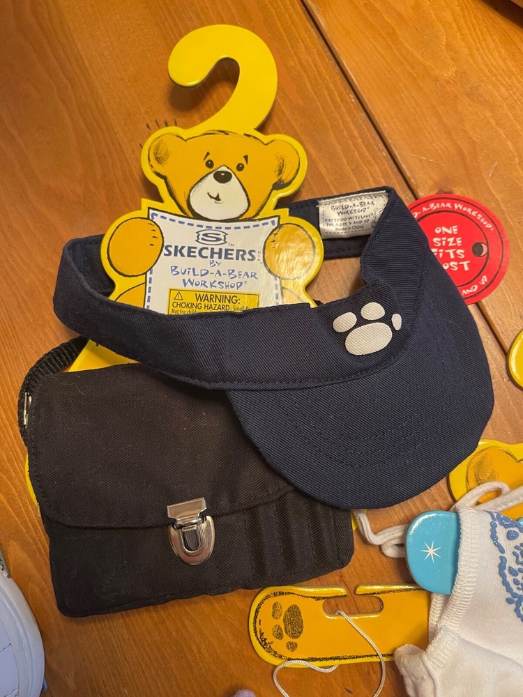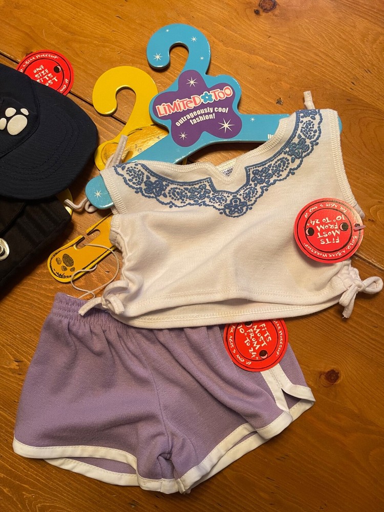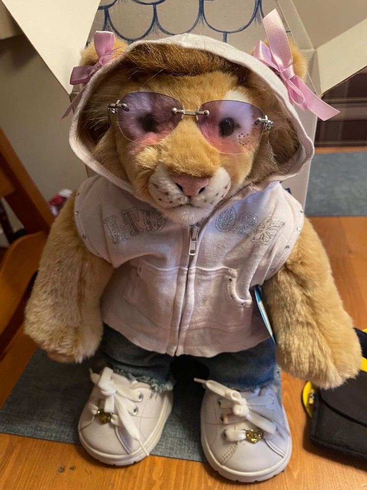Like New, most tags still attached! 2003 / 2004 WWF Lion Build-A-Bear (with tag), with denim shorts (no tag), Limited Too White and Silver Glitter Zip Up Hooded Shirt (with tag, minor stain on bottom - see photo), Limited Too White and Blue Shirt (with tag), Purple and white paw print shorts (with tag), Navy Visor (with tag), Book bag with paper, pencils (no tag, some paper used), Skechers white leather shoes (unsure if real or faux leather; small stain on shoelace - see photo; with hanger, no tag), Purple sunglasses (no tag; one jewel/rhinestone missing), Two purple bows, and House carrying box. Original value of all: approx $80-$90