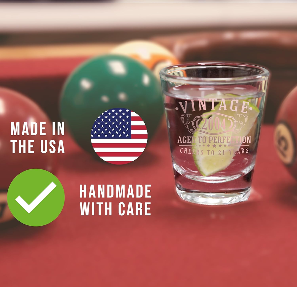 Store New Arrivals Add to Favorite View Feedback Contact Fast deliveries to the customer's home Quality customer service John Make the customers happy! Vintage 2004 Rose Gold Printed 1.75Oz 1Pk Shot Glass - Happy 21St Birthday Gifts Women Men, Cheers to 21 Years, Turning 21 Woman Decorations Decor, Anniversary Bday Party Favors, Best Gift Ideas 1.0 Description This shot glass will hold 1.75 ounces and is a perfect gift for someone who has everything. Mom and Dad are always hard to shop for, or pick up a glass for your brothers, sisters, uncles, aunts, and friends. Everyone will love this shot glass, it’s a gift built to last. Printed design is high quality and dishwasher safe, making these easy to care for. This shot glass with the vintage design is a gift that will make any birthday more special. Height: 2.38 inches, Diameter: 2 inches - Perfect size for a good time with friends and family that enjoy spirits, tequila, vodka, and other liquor. It can also be used as a measuring glass for cocktails. This vintage premium shot glass is made in Fayetteville, Arkansas, by a dedicated local team. We strive to give anyone turning 21 a special way to celebrate. Wish the guy or girl in your life a very happy birthday with this great gift. Gift wrap ready and ideal for lovers of espresso, mixed shooters, and shots. A shot glass makes a playful touch for cake decorations and adds charm to gift baskets. It’s perfect for holding small treats or enhancing dessert presentations with a unique flair. Product Description 21st Birthday Vintage Printed Shot Glass Vintage ‘2004’ Design – The bold, stylish print gives this shot glass a unique, nostalgic look, making it a perfect keepsake for anyone celebrating their 21st birthday in style. Perfect for Gifting – A thoughtful, fun, and practical gift for anyone turning 21. It’s a unique way to celebrate the milestone with something they can cherish. Great for Party Favors & Decorations – Whether used as a toast glass, centerpiece, or party favor, this shot glass adds charm to any 21st birthday celebration. Personalized Shot Glasses Add to Cart Add to Cart Add to Cart Add to Cart Add to Cart Add to Cart Customer Reviews 4.7 out of 5 stars 919 4.7 out of 5 stars 126 4.4 out of 5 stars 67 4.7 out of 5 stars 31 4.9 out of 5 stars 38 5.0 out of 5 stars 11 Price $8.99 $ 8 . 99 $18.99 $ 18 . 99 $18.99 $ 18 . 99 $18.99 $ 18 . 99 $18.99 $ 18 . 99 $18.99 $ 18 . 99 Digitally Printed ✘ ✔ ✔ ✔ ✔ ✔ Pad Printed ✔ ✘ ✘ ✘ ✘ ✘ Personalization Available ✘ ✔ ✔ ✔ ✔ ✔ Multi Quantity Available ✔ ✔ ✔ ✔ ✔ ✔ Full Color Customization ✘ ✔ ✔ ✔ ✔ ✔ Gift Box Available ✘ ✔ ✔ ✔ ✔ ✘ Reusability Reusable Unit Count 1.0 Count Style 2004- Rose Gold Number of Items 1 Color Rose Gold Material Glass Capacity 1.75 Fluid Ounces Theme Birthday Item Weight 4.2 ounces Shape Rectangular Material Feature Dishwasher safe Occasion Birthday Special Feature Dishwasher Safe Product Dimensions 2"W x 2.38"H Included Components Shot Glass ABOUT US We offer the best prices around on high quality products. Our E-store includes media such as books, movies, music and games while offering electronics, toys, sporting apparel, clothing, tools, general home, garden items and more. SHIPPING We are always working hard to ensure your package arrives as soon as possible. Please understand that some factors like weather, high postal traffic, and the performance of shipping companies are outside of our control. We offer free shipping to the lower 48 states and ship within 2 business days of payment, usually sooner. We do not accept P.O. Boxes. Please provide a physical address. For shipping outside of the continental USA, we only use eBay's Global Shipping Program. The item is shipped to KY and then sent to the rest of the world. International customers are responsible for all duties and taxes. Continue to 'check out' to calculate costs for shipping the item to your country. Messages regarding eBay's Global Shipping Program MUST be directed at eBay EXCLUSIVELY. RETURNS We offer a 30-Day Return Policy on items in which you are not completely satisfied with. You have the option of a full-refund or an exchange of the item. No returns are available on items shipped outside of the USA PAYMENT We accept PayPal. CONTACT US This page content is yet to come Please ad us to your favorite seller and visit again later Thank You CUSTOMER SATISFACTION We try our very best to make sure every customer is completely satisfied. If there's a problem, message us! We're happy to help. WE ACCEPT