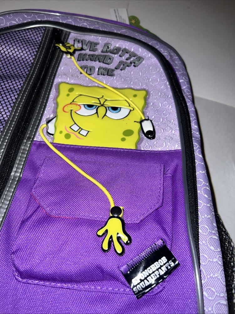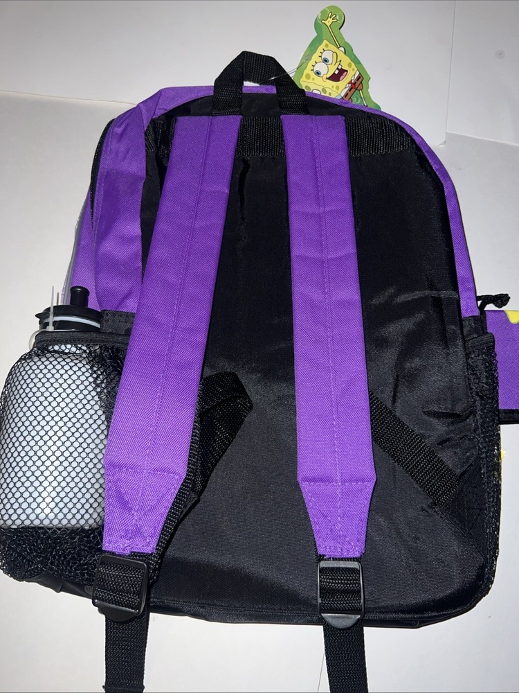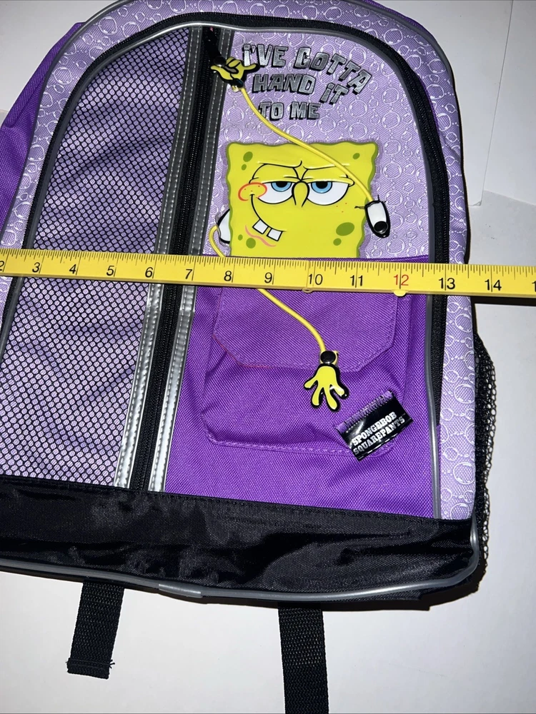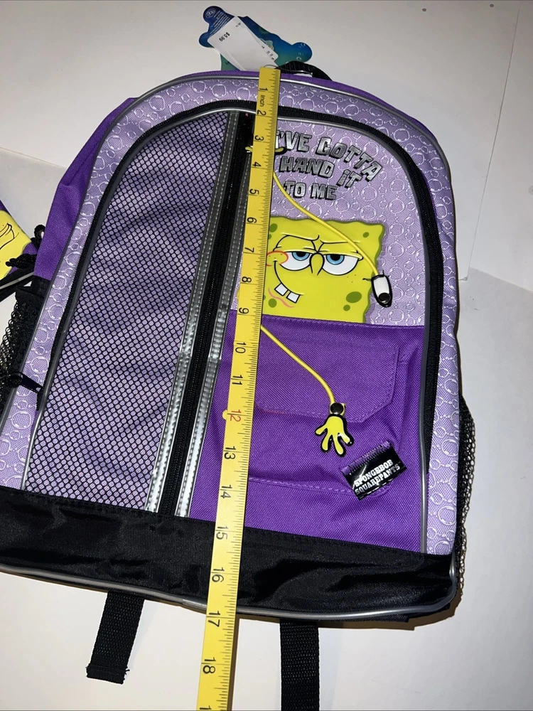 Accents:SpongeBob SquarePantsHandle Style:Shoulder StrapTheme:SchoolYear Manufactured:2004Features:Adjustable StrapDepartment:Unisex KidsUPC:Does not applyStrap Drop:see descriptionLining Material:FabricBrand:VintageFabric Type:Blended FabricHandmade:NoOccasion:Casual, TravelClosure:ZipColor:PurplePattern:SpongeBob SquarePantsCharacter:SpongeBob SquarePantsMPN:does not applyBag Height:17inPersonalize:NoBag Depth:5 inVintage:NoMaterial:CanvasProduct Line:SpongeBob SquarePantsSize:LargeModel:Spongebob 16" Backpack,Lunchbox,&Stationarygtin13:Does not applyCalifornia Prop 65 Warning:Contains small parts choking hazard so not intended for children under age 3 so requires adult supervision.Character Family:SpongeBob SquarePantsHardware Material:AluminumStyle:BackpackHandle/Strap Material:100% Nylon, CanvasCountry of Origin:ChinaBag Width:13 in