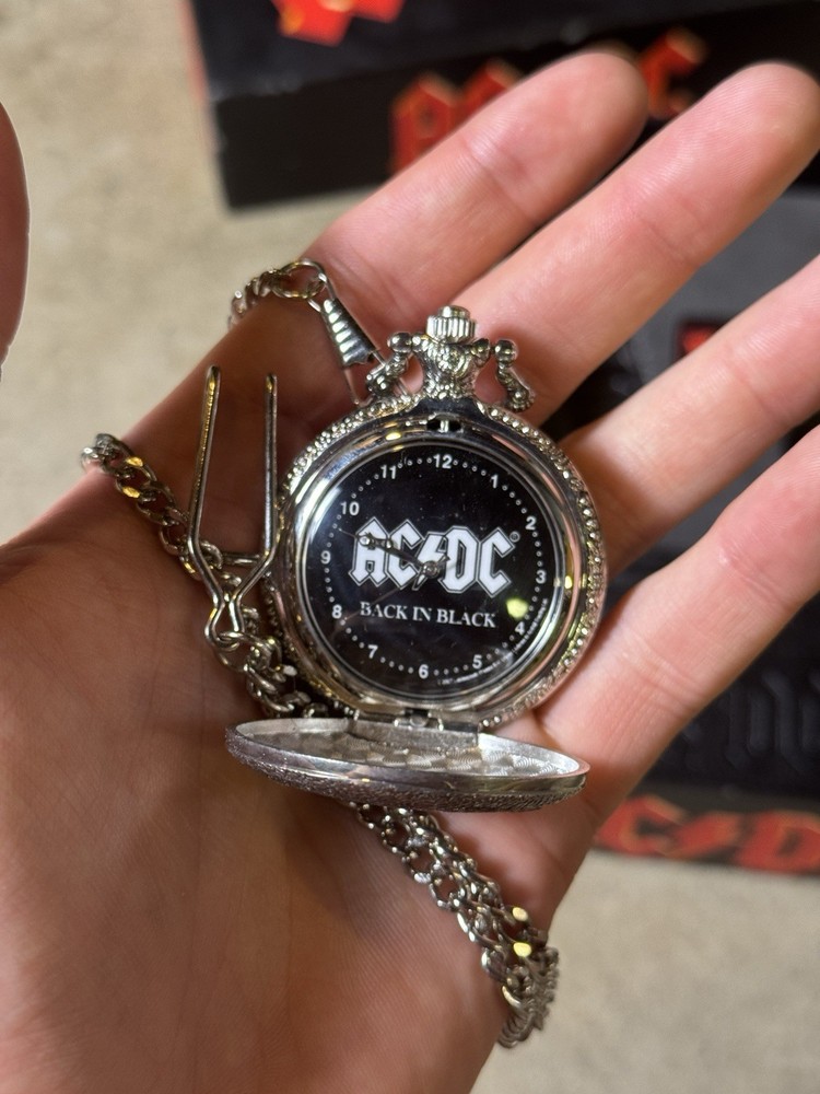 The vintage 2007 AC/DC pocket watch, keychain, and wallet set features a quartz movement and a classic design perfect for casual wear. The pocket watch has a 12-hour dial and is in the style of the iconic rock band AC/DC, making it a unique and stylish accessory. With its analog display and unisex appeal, this set is sure to be a standout piece for any AC/DC fan or watch enthusiast looking to add some rock 'n' roll flair to their collection.