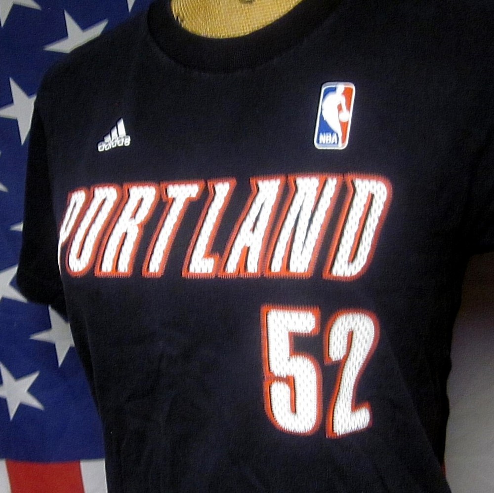 PORTLAND TRAIL BLAZERS Greg Oden youth med T shirt #52 circa 2007 black tee NBA This is a previously-owned, youth-medium (YM), black T-shirt with "Portland / 52" printed on the front and “Oden / 52” printed on the back. It measures approximately 17 inches (from underarm seam to underarm seam), about 22 inches from back collar to bottom, and is in great shape (Adidas brand, 100% cotton). Greg Oden Jr. played college basketball at Ohio State University for one season, during which the team was the Big Ten Conference regular season champion and Big Ten Conference men's basketball tournament champion with Oden as the tournament MOP. Additionally, Oden and the Buckeyes were the tournament runner-up in the NCAA Men's Division I Basketball Championship. In 2007, Oden was selected first overall in the 2007 NBA draft by the Portland Trail Blazers. In 2012, he was waived by the Trail Blazers after a long history of injuries and signed with the Miami Heat in 2013, more than three years after last appearing in an NBA game… Powered by SixBit's eCommerce Solution