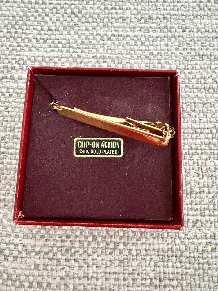 Vintage "CLIP-ON ACTION" 24k gold-plated tie bar (or tie clip) with a safety chain. It is designed for securing a necktie to a shirt placket from the mid-20th century. In original box without box top.