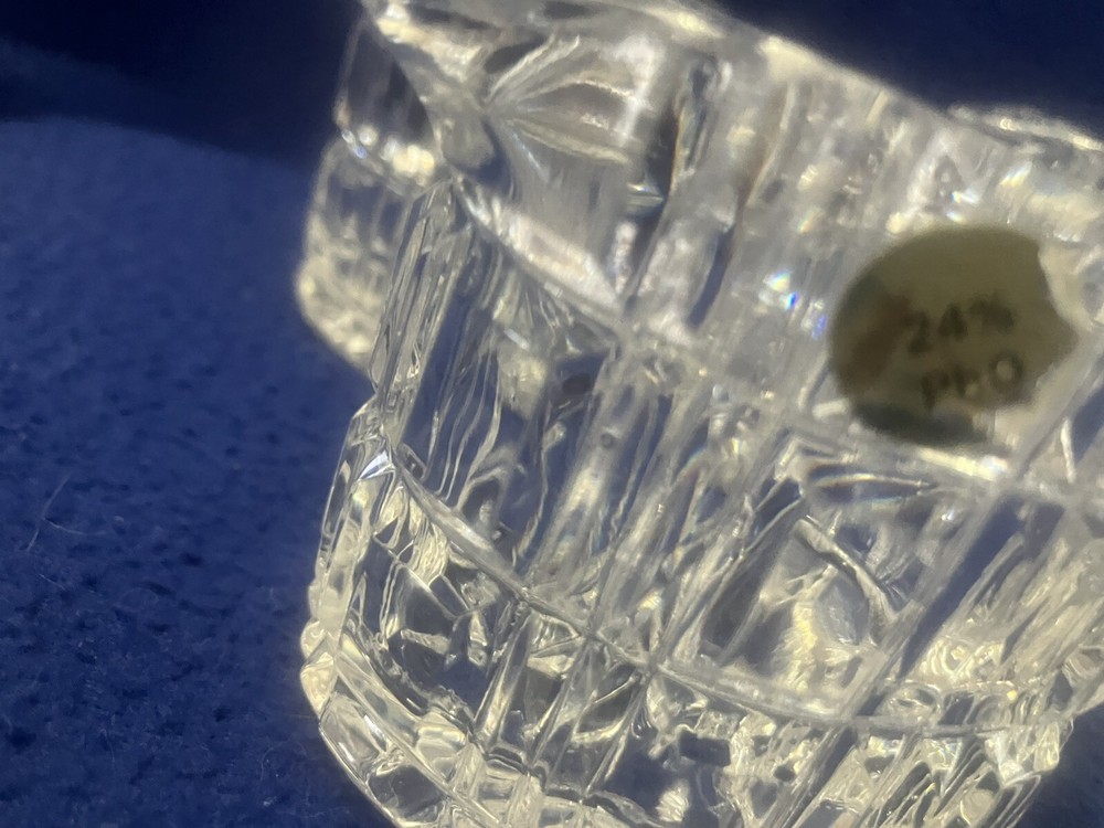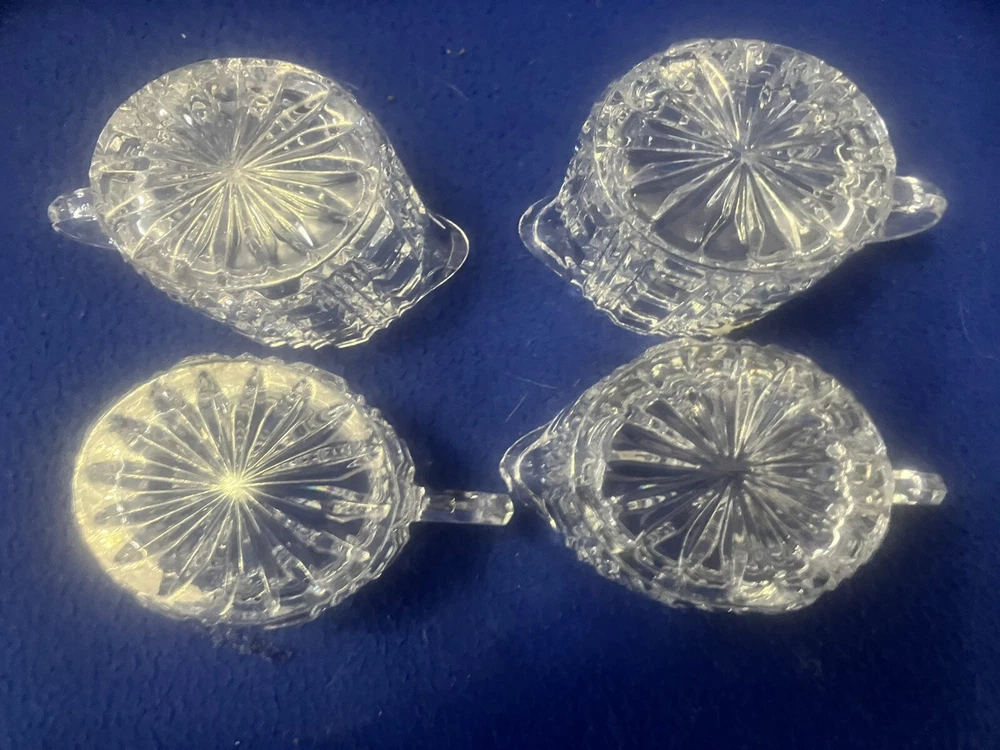 Presenting timeless pieces of elegance: four vintage 24% Lead Crystal Mid Century Modern Creamers, unmarked, featuring a refined oval shape and adorned with a delicate block pattern. Each piece has a gold sticker marked 24% PbO. Each approximately 3.5” in height and 3” long. Use as creamers at individual place settings or to hold cotton or q-tips on vanity or dresser! The sparkle created when light shines through this crystal is just stunning! Perfect for adding a touch of vintage charm to your table or home!
