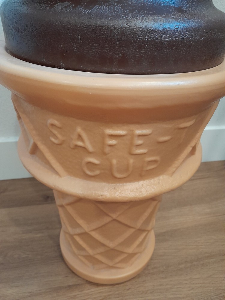 This vintage SAFE-T CUP bank is a delightful addition to any collection. Measuring 26 inches tall, it features a chocolate swirl design that is sure to bring a smile to your face. Made from durable plastic, this bank was manufactured in the United States and is an original piece. Perfect for collectors of all ages, this bank is a unique and fun way to save your spare change. Whether you display it on a shelf or use it to stash your coins, this piece is sure to make a statement. Add this charming vintage bank to your collection today! No cracks.