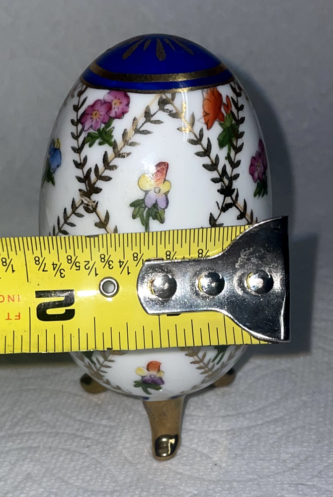 Hinged Porcelain tri-Footed Egg Shaped Trinket Box Pre-owned, no chips or cracks. No back stamp or origin. The egg shaped trinket box has 3 legs hand painted gold gilt. The unit measures 4 inches high 2" wide. ATTENTION REGARDING SHIPPING !! Shipping costs are expensive. Here is an offer that is hard to refuse. If you buy 2 or more items totaling $50 or more , I will handle the shipping cost (ground) anywhere in the continental United States. The items cannot be listed as having to be shipped alone due to SPECIAL PACKING NEEDS . eBay does not adjust the shipping cost removal from the invoice automatically. I can do it on the final invoice after you have the items in your shopping basket, before you pay. If eBay forces payment before that is done, you will receive a refund of shipping cost made before your package is shipped within the first business day following the transaction. The free shipping offer does not apply to Priority or Expedited shipping, although we can discuss a fair reduction in shipping cost should you desire the shipping upgrade. LOOKING FOR LESS EXPENSIVE SHIPPING? Click on "See details" next to Expedited Shipping Fee above to see other shipping options. eBay calculates the shipping fee based on package size, weight and type of shipping you select. SAVE SHIPPING COSTS! – USE COMBINED SHIPPING Shipping costs are high. The best way to save money on shipping costs is through combined shipping,… purchasing more than 1 item and having them shipped together. The cost per item drops substantially. To do this you MUST NOT pay for items until after the combined shipping cost has been calculated on the invoice. If you pay before this has been done you will end up paying the individual shipping cost for each item, and I am unable to issue refunds for shipping overpayments when this occurs because eBay does not refund the fees they charge me on the refunded amount.