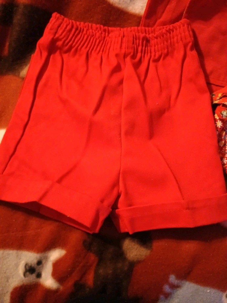This vintage 3-piece girls set in size 2t-3t is adorable with a floral pattern and red color. Made from a comfortable cotton blend fabric, the set includes a t-shirt, shorts, and a casual shirt, perfect for the summer and spring seasons. The outfit has a 60s theme and features a bow accent, adding a charming touch to the set. The brand, BusyB, ensures quality and style for your little one.The front pocket of the red shirt does need to be resown. It's just one corner of the pocket of the shirt...it is pictured.An easy fix though!