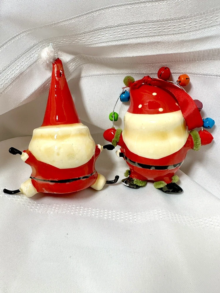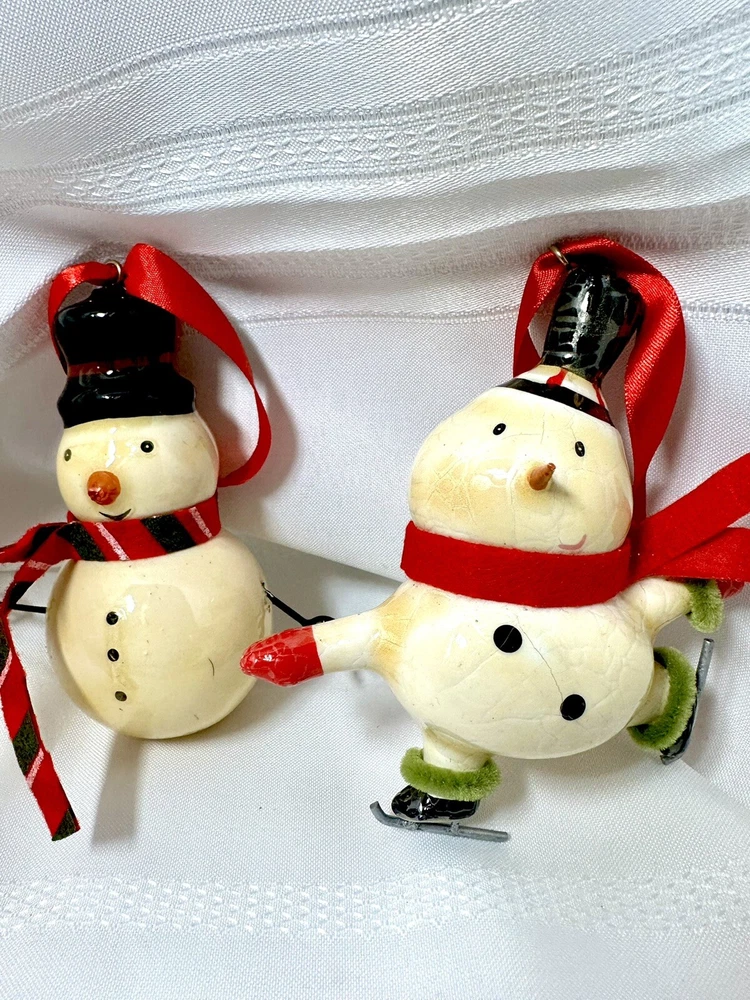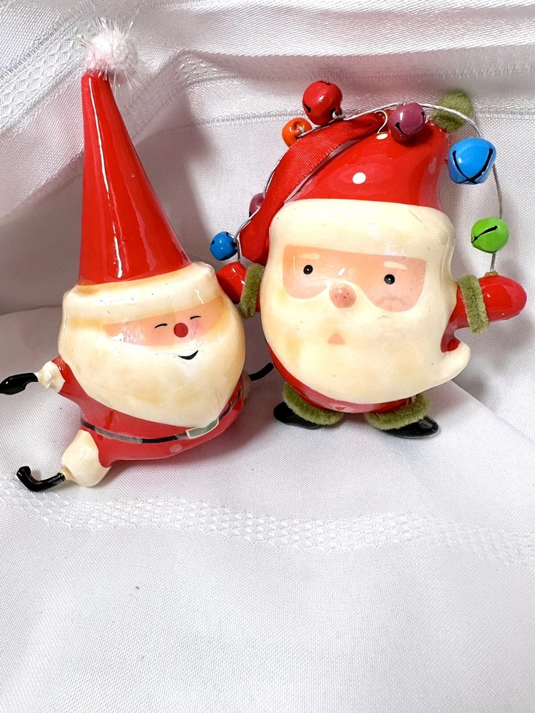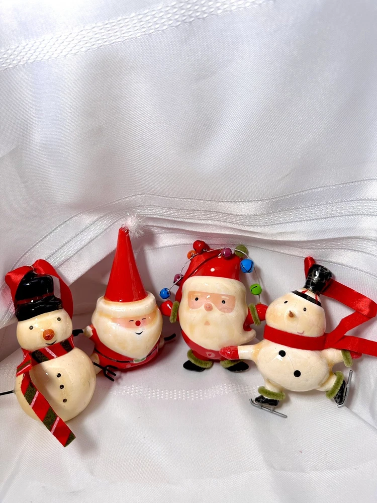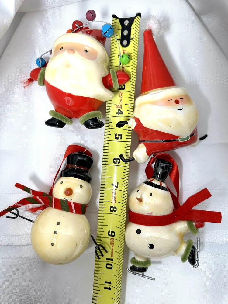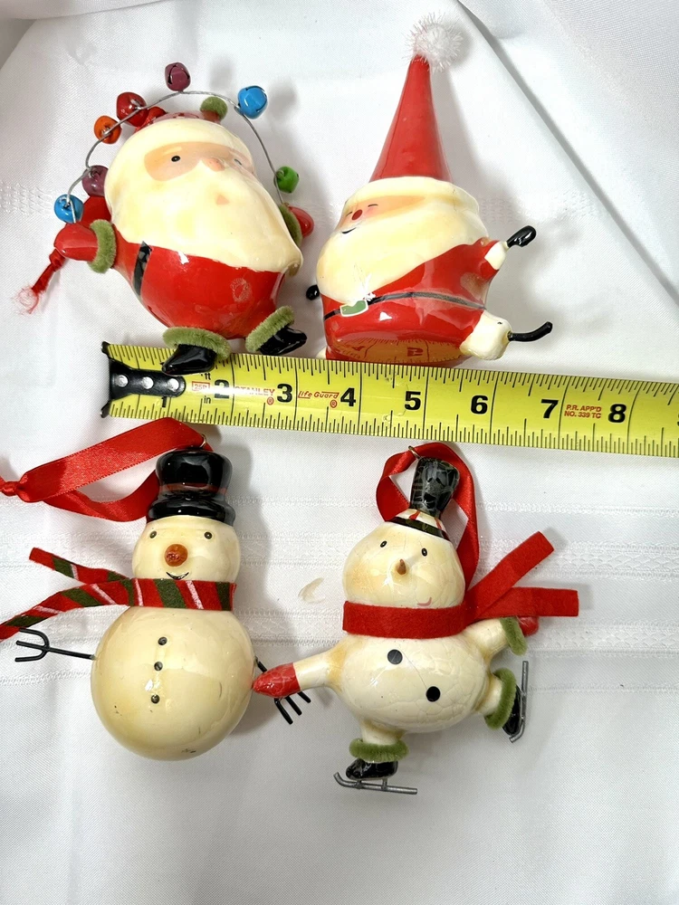 Vintage LOT OF 4 Christmas Holiday Tree Ornaments Decoration: 2 Santa Claus and 2 Frosty the Snowman. Made from glazed foam to look like porcelain Pieces are in Great shape for there age with some wear and aging , but display excellent for their age.
