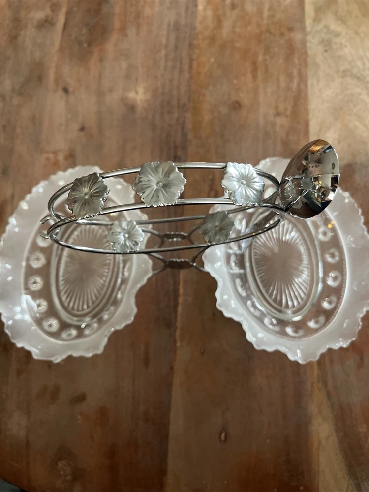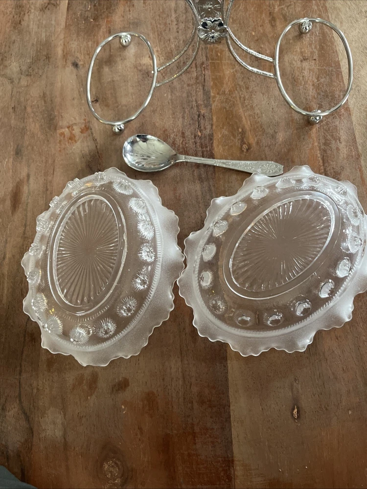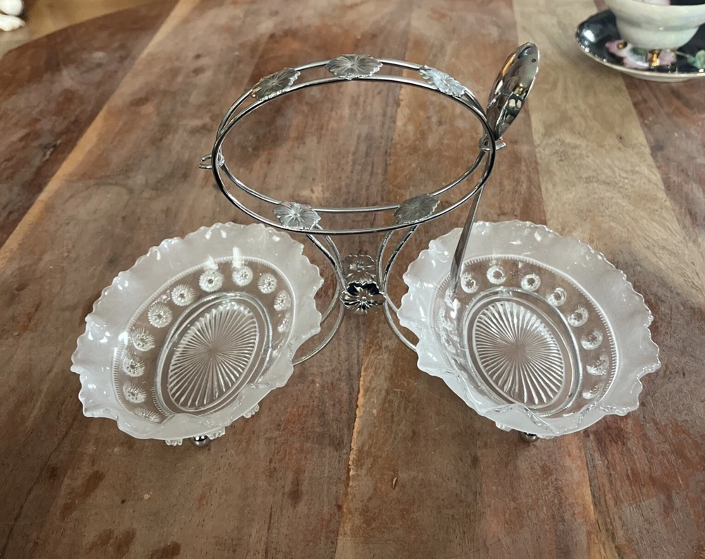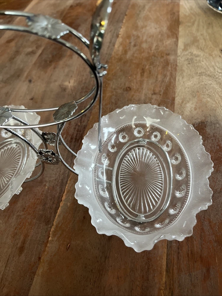Add a touch of vintage charm to your dining experience with this 4-piece set from Sheffield, England. This set includes a beautifully crafted olive or relish dish, complete with a carrier and a spoon, all made from high-quality chromium plate for lasting durability. The intricate design and attention to detail make this set a perfect addition to any dinnerware collection. The dish and spoon set is perfect for any occasion, whether it's a formal dinner party or a casual family meal. The set is not handmade and has not been modified in any way, ensuring its originality and authenticity. Bring the elegance of vintage dinnerware to your home with this stunning set from Sheffield.