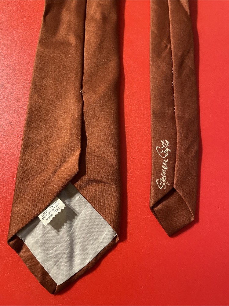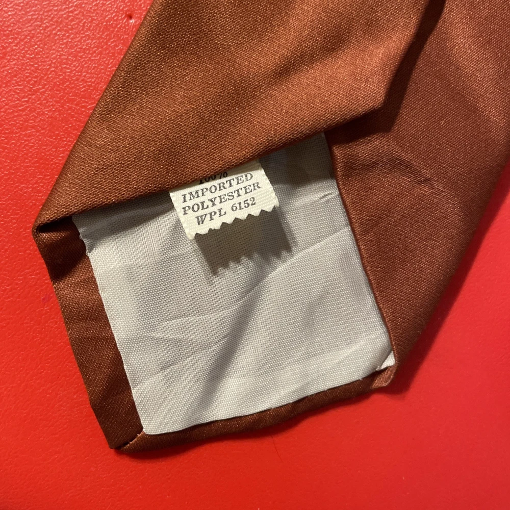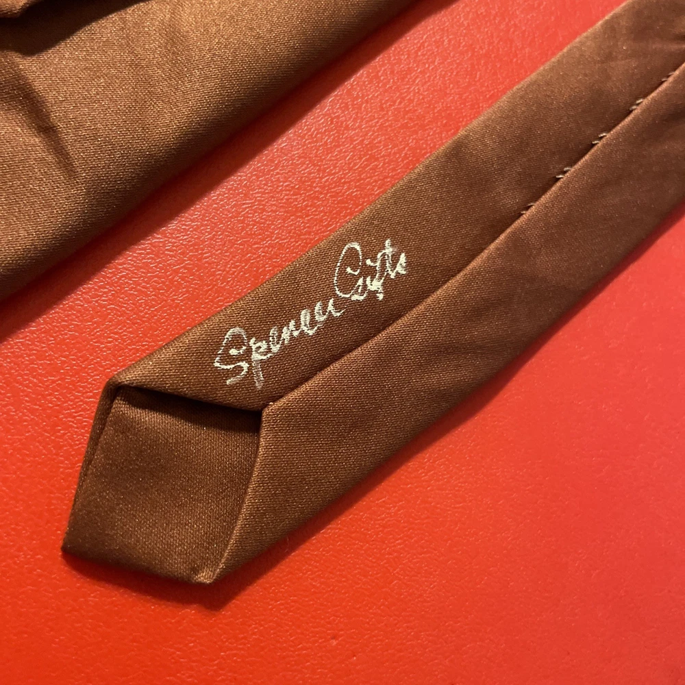 Make a statement with this vintage tie from the 40s to 50s era. The mirrored hand-painted name pattern adds a unique touch to this classic piece. With its copper color and EARLY polyester fabric type, this tie is perfect for adding a touch of art deco, swing, and rockabilly style to your wardrobe. The tie features a classic width and a retro, symmetrical design that is perfect for any occasion. Spencer’s Gifts presents this one-of-a-kind tie, made in the United States, that will surely make you stand out from the crowd. The tie is perfect for any fan of atomic, retro, and symmetrical designs. Get ready to add a vintage touch to your wardrobe with this exquisite piece. VERY EARLY polyester and also very early from Spencer’s! Hand painted and also even the brand logo on back is painted too.