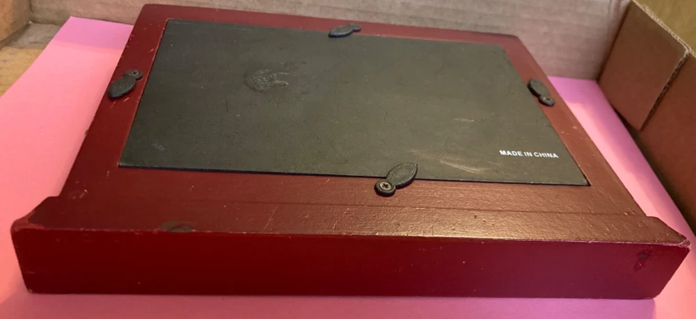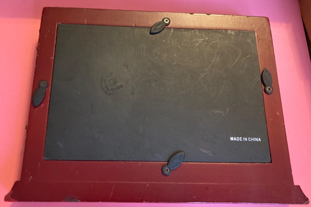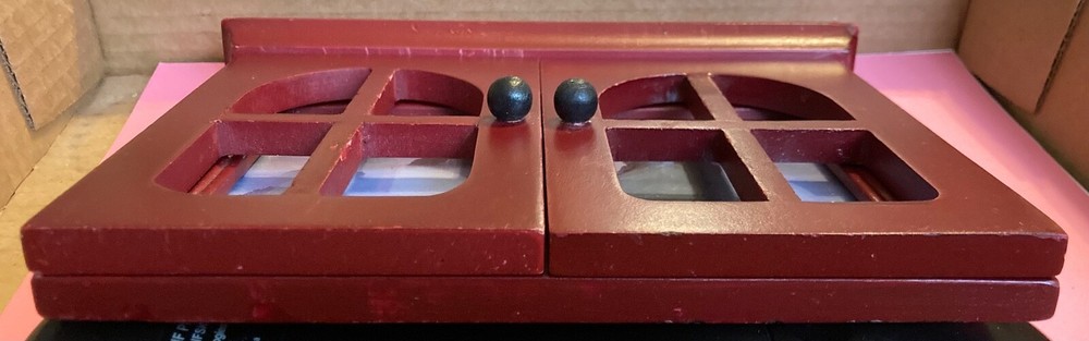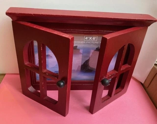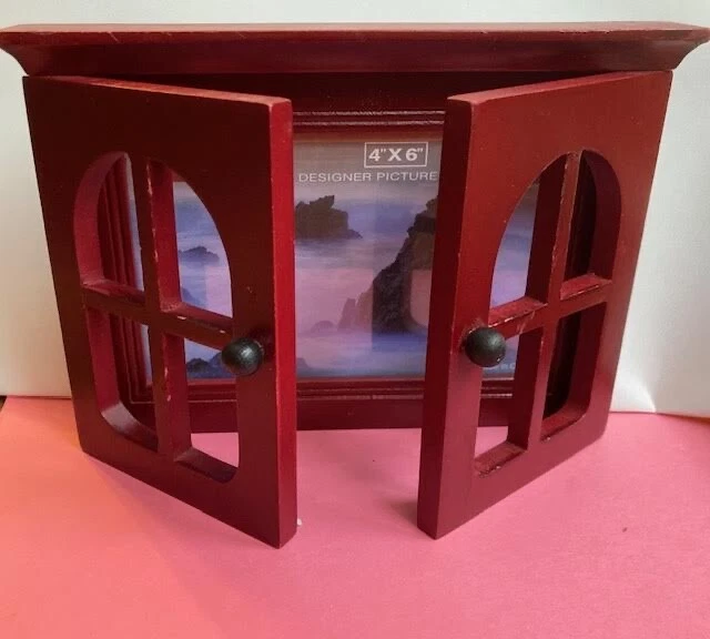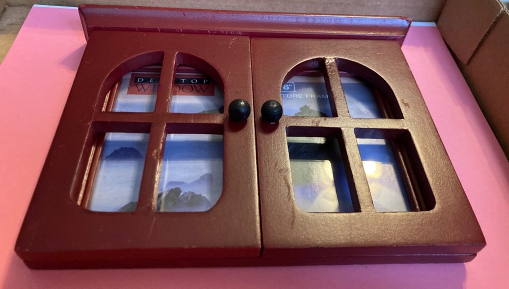The product is a vintage 4x6 wood tabletop photo frame with a design of windows open. It has a height of 5 5/8 inches, a length of 7 7/8 inches, and a width of 1 1/8 inches. The frame is suitable for holding 4x6 inch photos and is made of wood. It would be a charming addition to home décor, perfect for displaying cherished photos. See photos for nicks and scratches